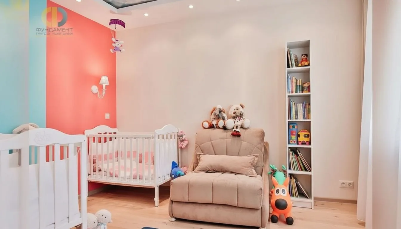 Детская комната заслуживает отдельного внимания, поскольку она проектировалась с учетом потребностей сразу двоих детей. Пространство разделено на функциональные зоны: зона сна расположена ближе к входу, а игровая — у окна, где больше естественного света. Использование мягкого ковра, компактной мебели и игровых элементов делает комнату комфортной и безопасной. Важно, что дети быстро адаптировались к новому пространству и с готовностью перешли к самостоятельному сну. Это показатель того, насколько грамотно продуман интерьер.