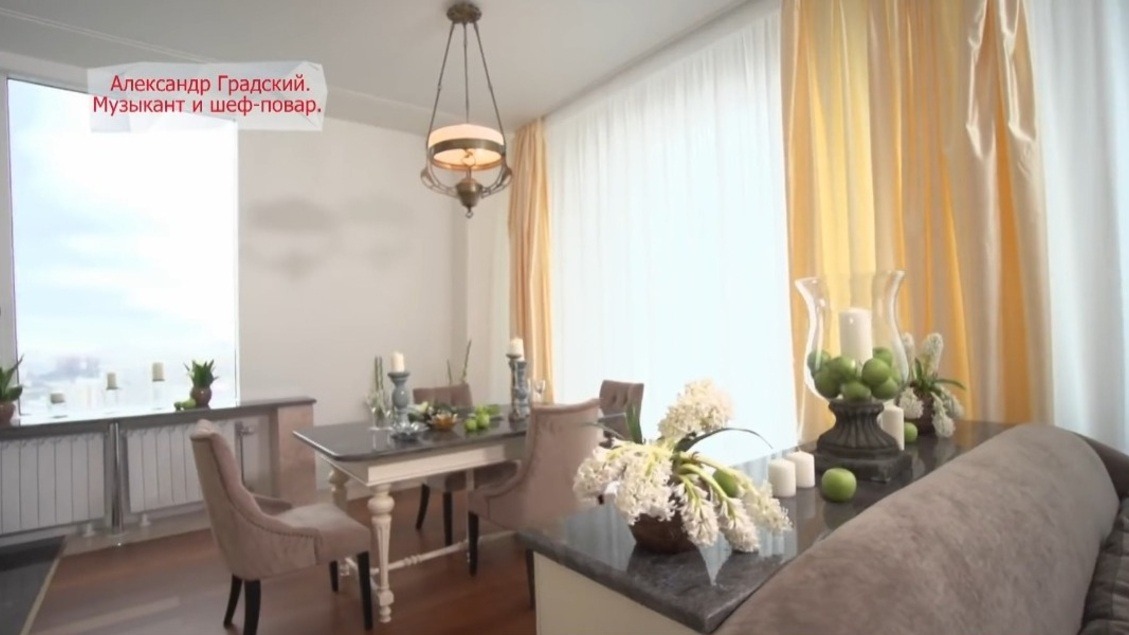 Градский доверился опыту специалистов и высказал лишь два пожелания. Первое — поделить пространство на зоны для готовки и отдыха. Второе — заменить занавески на более легкие и воздушные, которые не будут скрывать вид из панорамных окон.