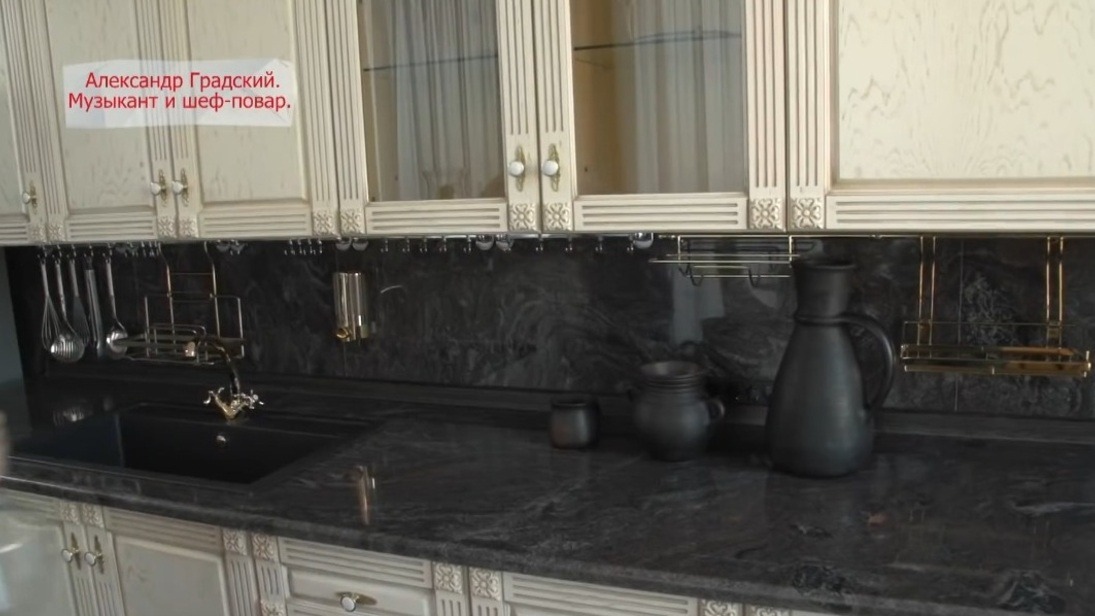 Кухонный гарнитур выполнен в эклектичном стиле — здесь сочетаются благородство классики и романтичность шебби-шик. Фасады изготовлены на заказ из массива дуба, выкрашены в спокойный цвет слоновой кости и декорированы позолотой. Гарнитур не просто красивый, но и функциональный — здесь много выкатных ящиков и распашных шкафов. Столешница и фартук из черного гранита и хромированные элементы контрастируют со светлым основанием, создавая глубину. Градский любил и умел готовить — наверняка на этой кухне под его рукой появилось немало изысканных блюд.