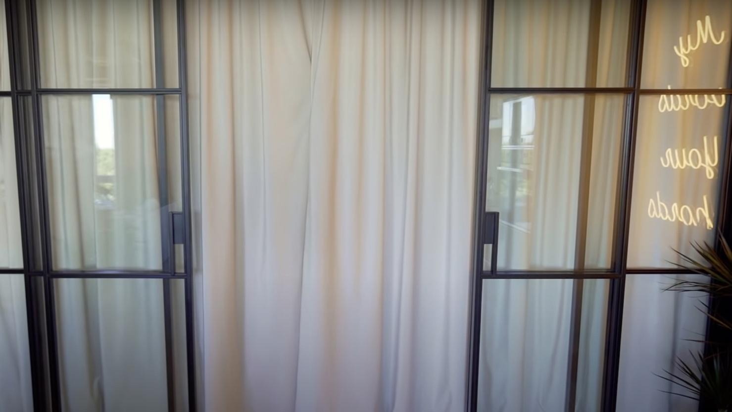Гостевая зона находится за стеклянной перегородкой со шторами. Здесь стоит диван, где гости могут чувствовать себя уютно и приватно. Между этой зоной и комнатой мамы Кати есть небольшое окошко, которое обеспечивает дополнительный свет и вентиляцию.