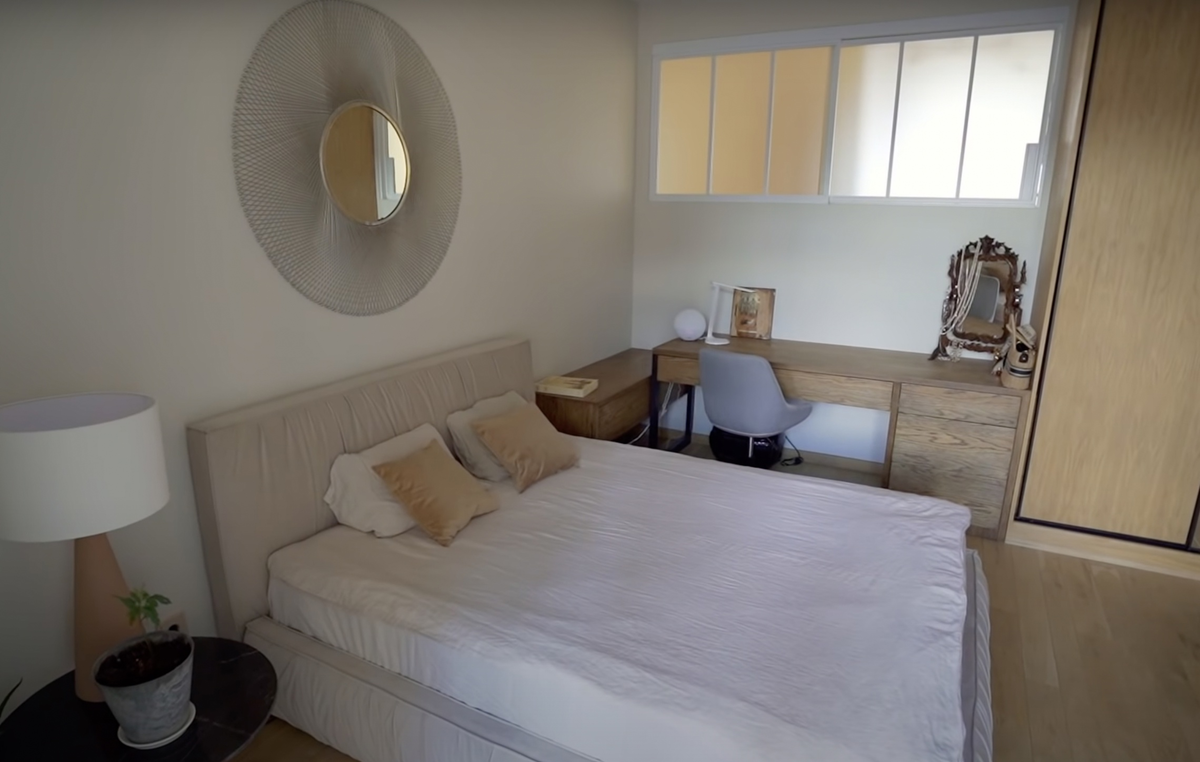 За перегородкой расположены ванная и гардеробная. Стол сделан эксклюзивно для Кати: без острых углов, с парой ножек и врезан в стену. Прикроватные тумбочки «парящие», а на стене размещены крепления для гитар Лёни — одна осталась в память об отце.