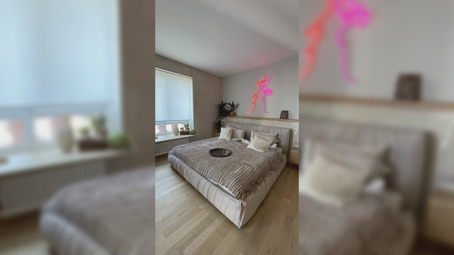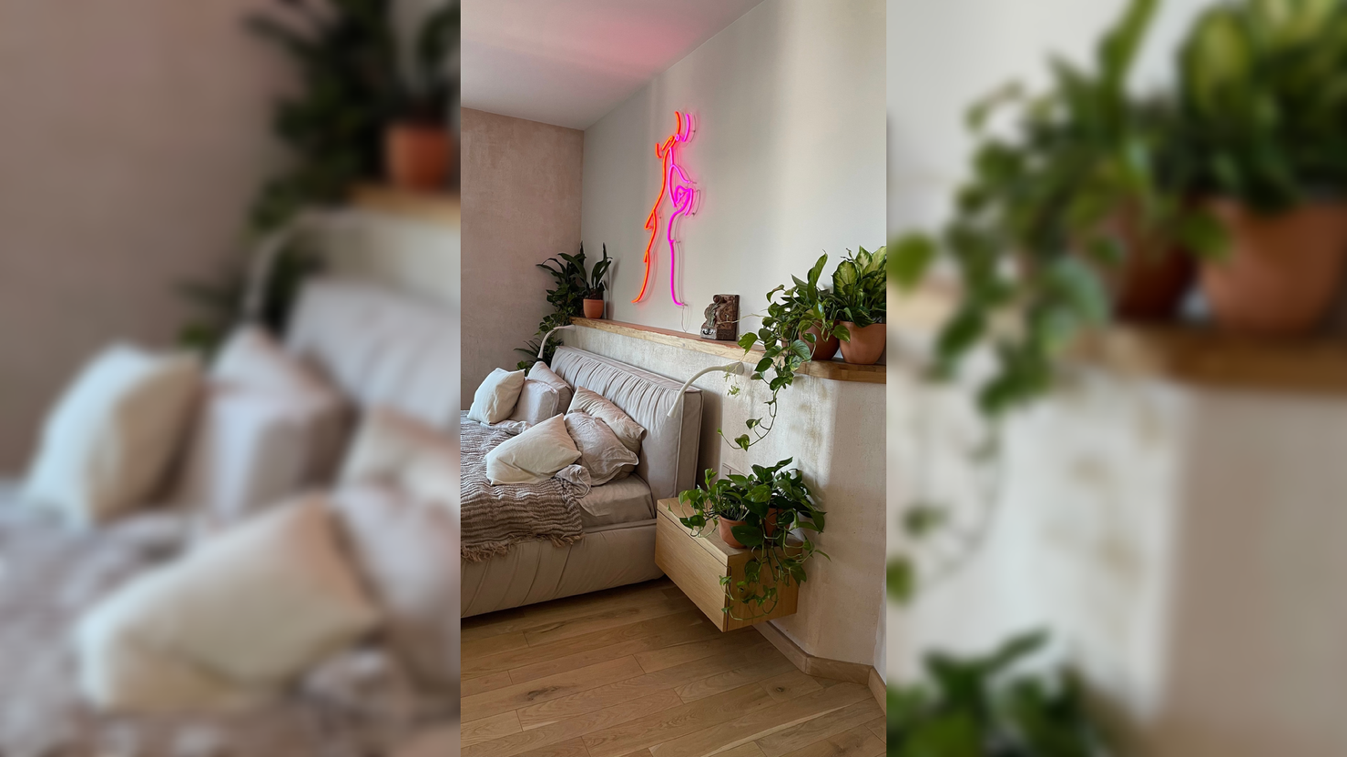 Мастер-спальня организована так, чтобы в ней было удобно и расслабляюще. Направление паркета учитывает расположение кровати, а над ней находится неоновая композиция с изображением губ.
