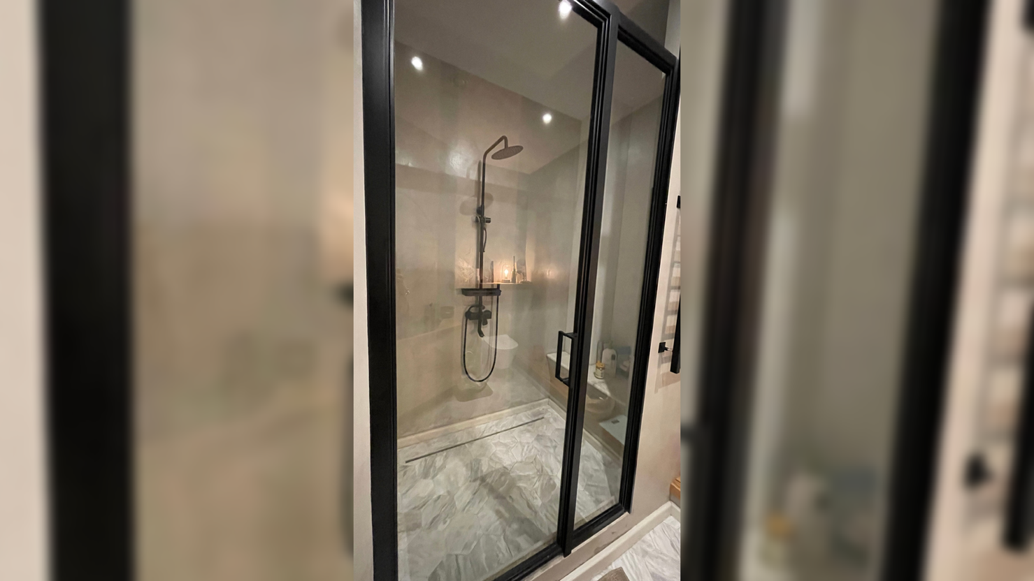 В этих зонах продумано всё: пока Лёня принимает душ, Катя может заниматься уходовыми процедурами. Пространство ванны защищено от воды с помощью оригинальной перегородки, а не стандартной шторы.