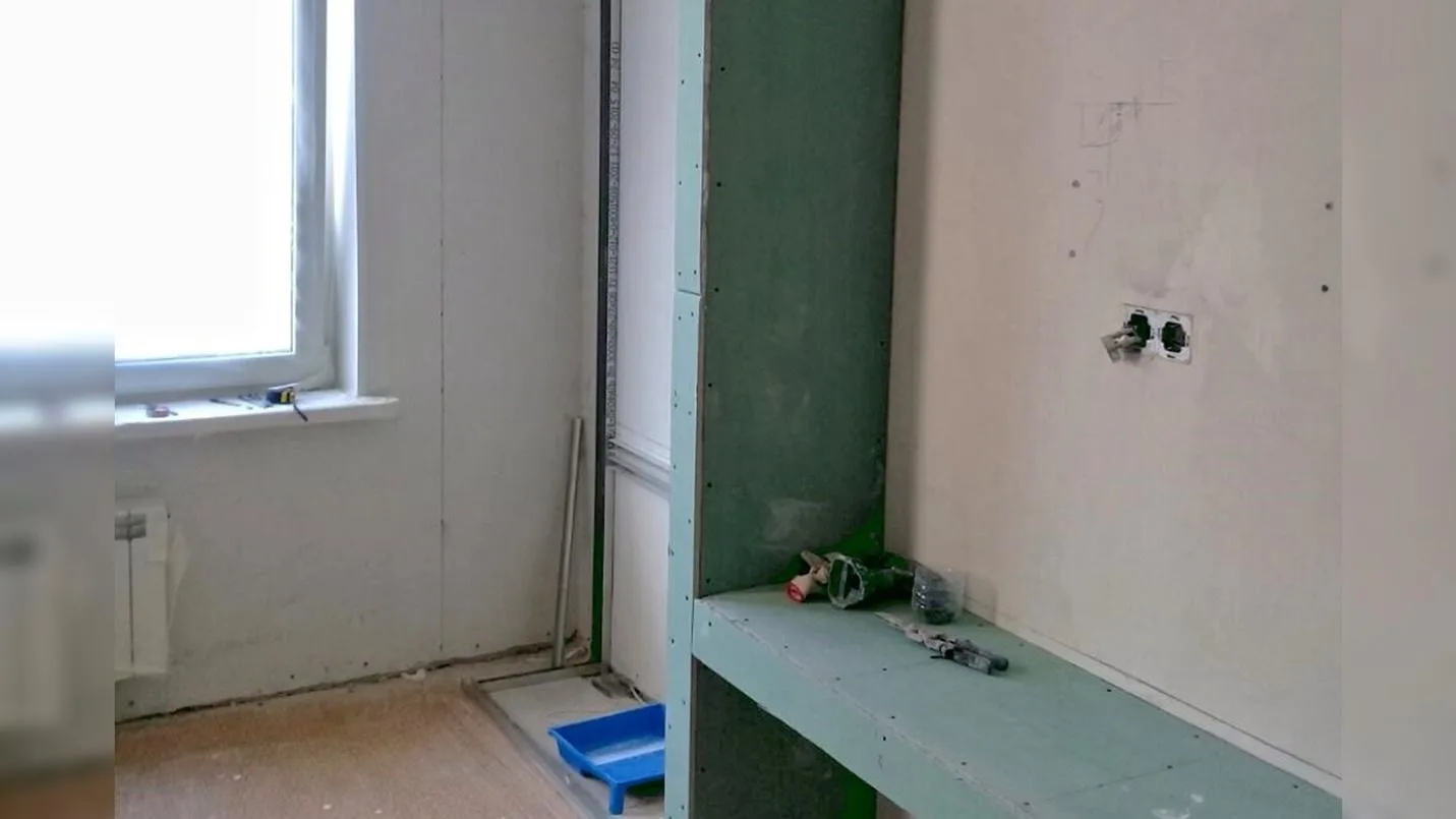 Сам процесс проектирования и ремонта был частично показан в рамках телевизионной программы «Ремонт по-честному». Зрители могли увидеть, как формируется концепция, подбираются материалы, разрабатываются цветовые решения и реализуются технические этапы. Такой формат наглядно демонстрирует, что качественный интерьер — это результат комплексной работы, а не набор случайных решений. До начала работ гостиная представляла собой пространство в стадии монтажа: формировались перегородки, создавались ниши, продумывались системы хранения. Одним из ключевых элементов стала конструкция в зоне ТВ — с боковыми стеллажами и декоративной нишей, которая в дальнейшем получила текстильное оформление. Уже на этом этапе закладывалась основа будущего интерьера — с четкой логикой зонирования и акцентом на функциональность.