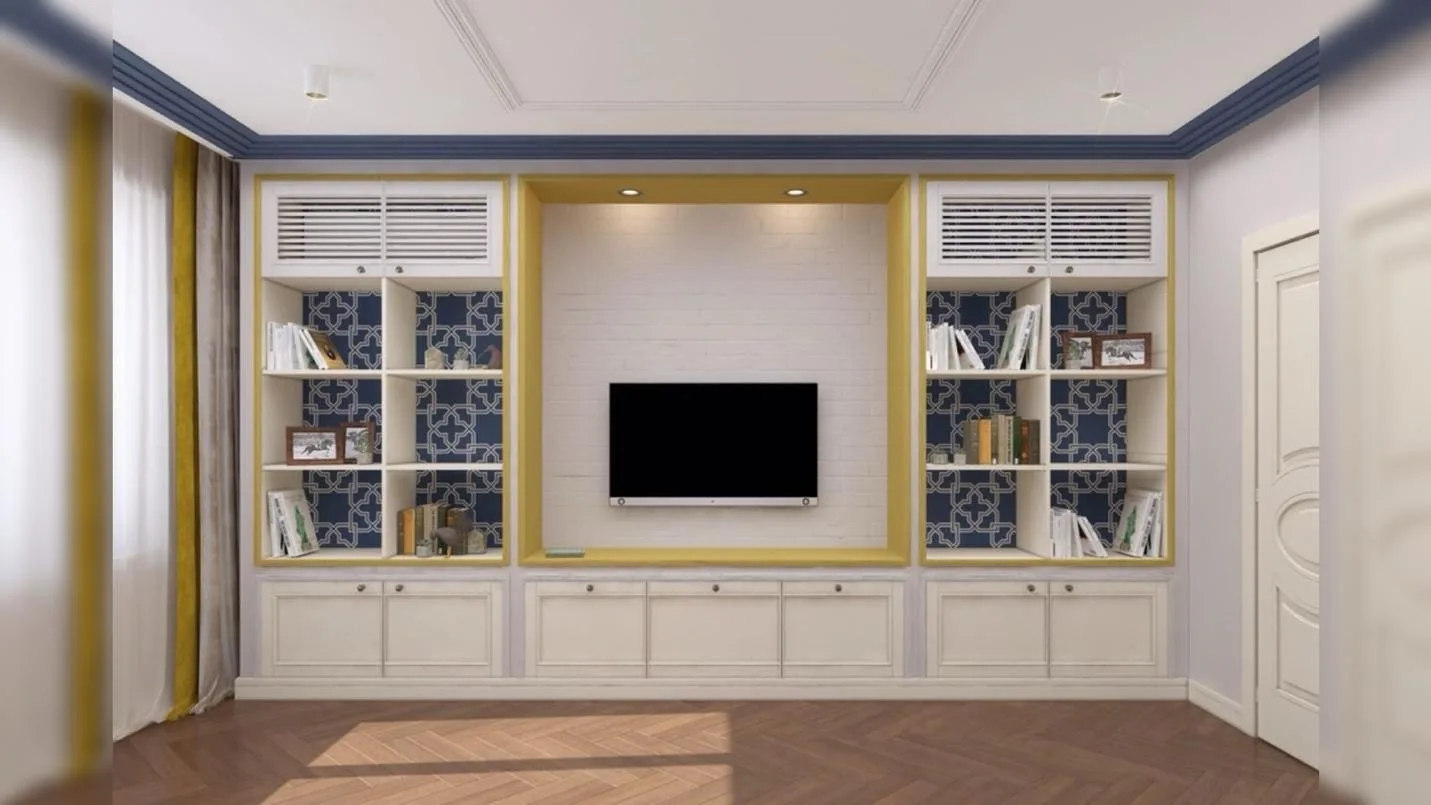 Особого внимания заслуживает система хранения. Она сочетает закрытые и открытые модули, что позволяет поддерживать порядок и одновременно использовать декоративные элементы. В зоне ТВ реализована ниша с отделкой под белый кирпич — прием, который добавляет интерьеру текстуру и глубину. Боковые стеллажи украшены орнаментами, отсылающими к эстетике ар-деко, что придает пространству легкий налет элегантности.