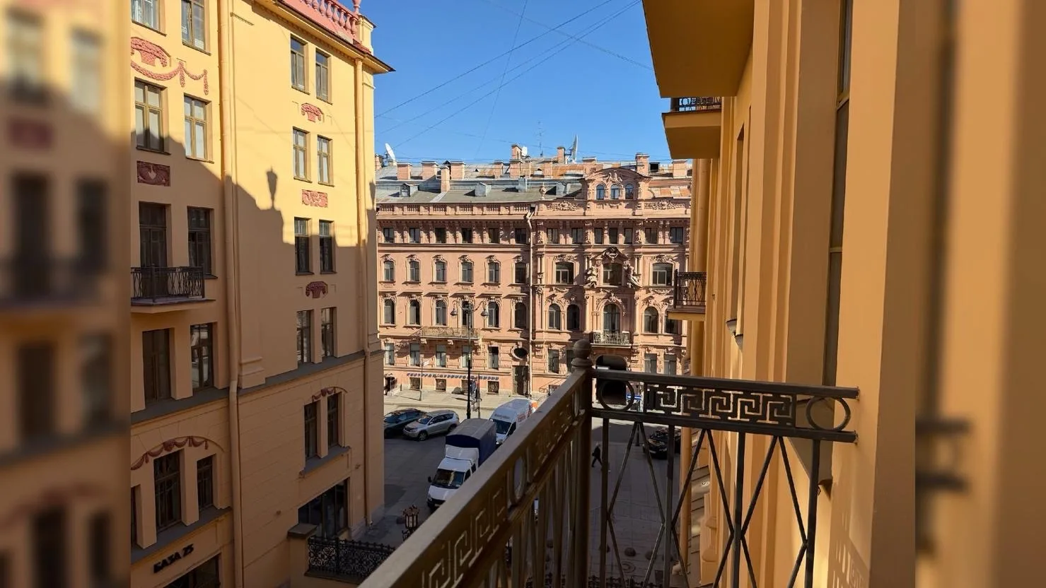 Финальным акцентом становится балкон с видом во двор и частично на улицу. Это не открытка с парадными фасадами, а настоящий городской пейзаж — честный, живой, без декораций. Именно такие виды формируют подлинное ощущение города. Они не стремятся впечатлить, но создают глубокую эмоциональную связь с местом.