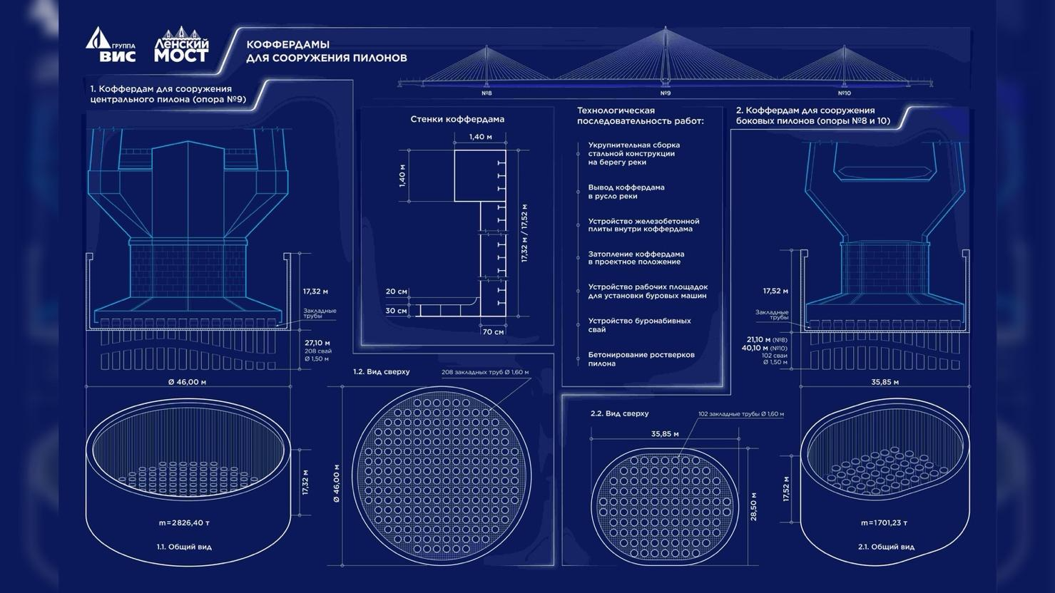 Интенсивный период строительства приходится на летние месяцы. На стройплощадку из Тюмени доставлены металлоконструкции для наплавных коффердамов. Эти временные конструкции, собираемые на берегу, станут основой для работ под водой в русле реки. Коффердамы — это водонепроницаемые каркасы, обеспечивающие сухие рабочие зоны для мостостроителей, позволяющие работать в условиях сильного течения, ледохода и колебаний уровня воды. Их использование позволит возвести три мощных пилоны: центральный высотой почти 285 метров, боковые — 194,5 метра. Пилоны будут удерживать пролетные строения моста.