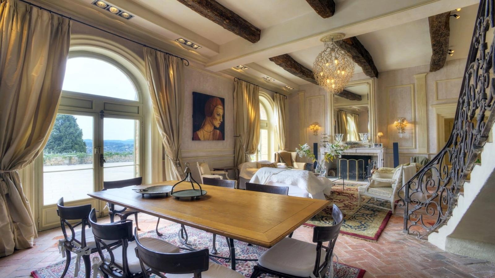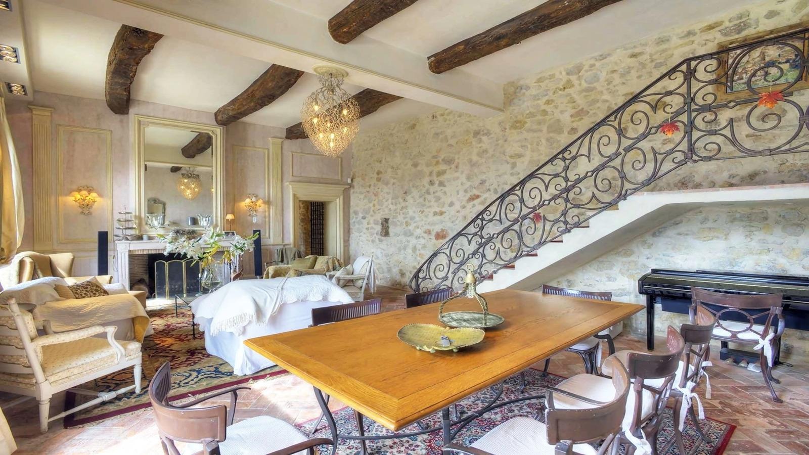 В интерьерах сохранены каменные полы, массивные деревянные балки на потолках, фактурная штукатурка стен. Центральное место в гостиной занимает монументальный камин в стиле Людовика XIV — тяжелый, основательный, словно созданный не для декора, а для вечности. Всё это формирует атмосферу, в которой прошлое не стилизовано, а по-настоящему присутствует.