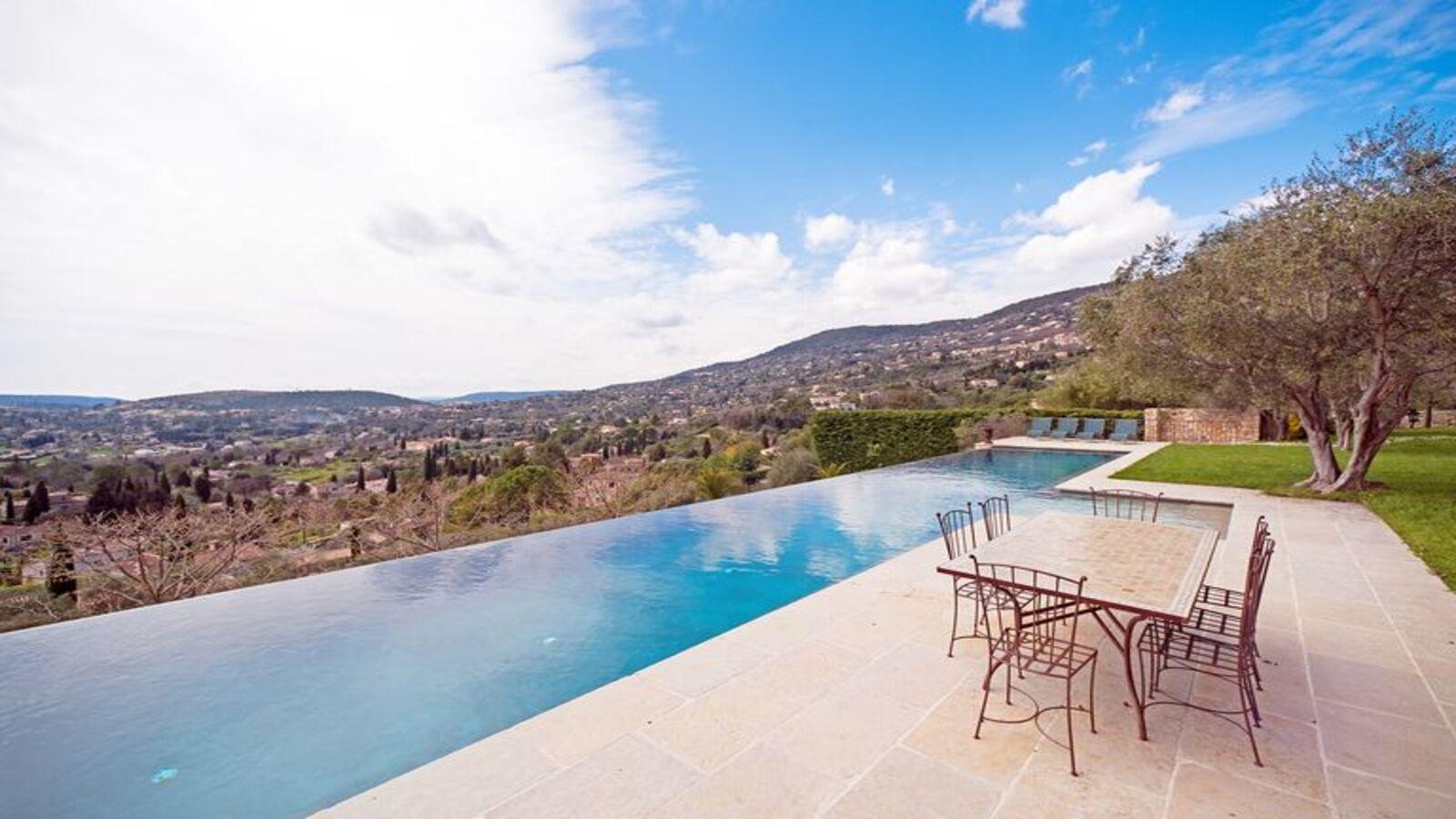 Одним из главных достоинств виллы остаётся её окружение. На верхнем уровне расположена просторная лоджия с летней кухней, плитой и обеденной зоной, рассчитанной примерно на 60 гостей. Это пространство идеально подходит для длинных ужинов на закате — тех самых, которые ассоциируются с югом Франции.