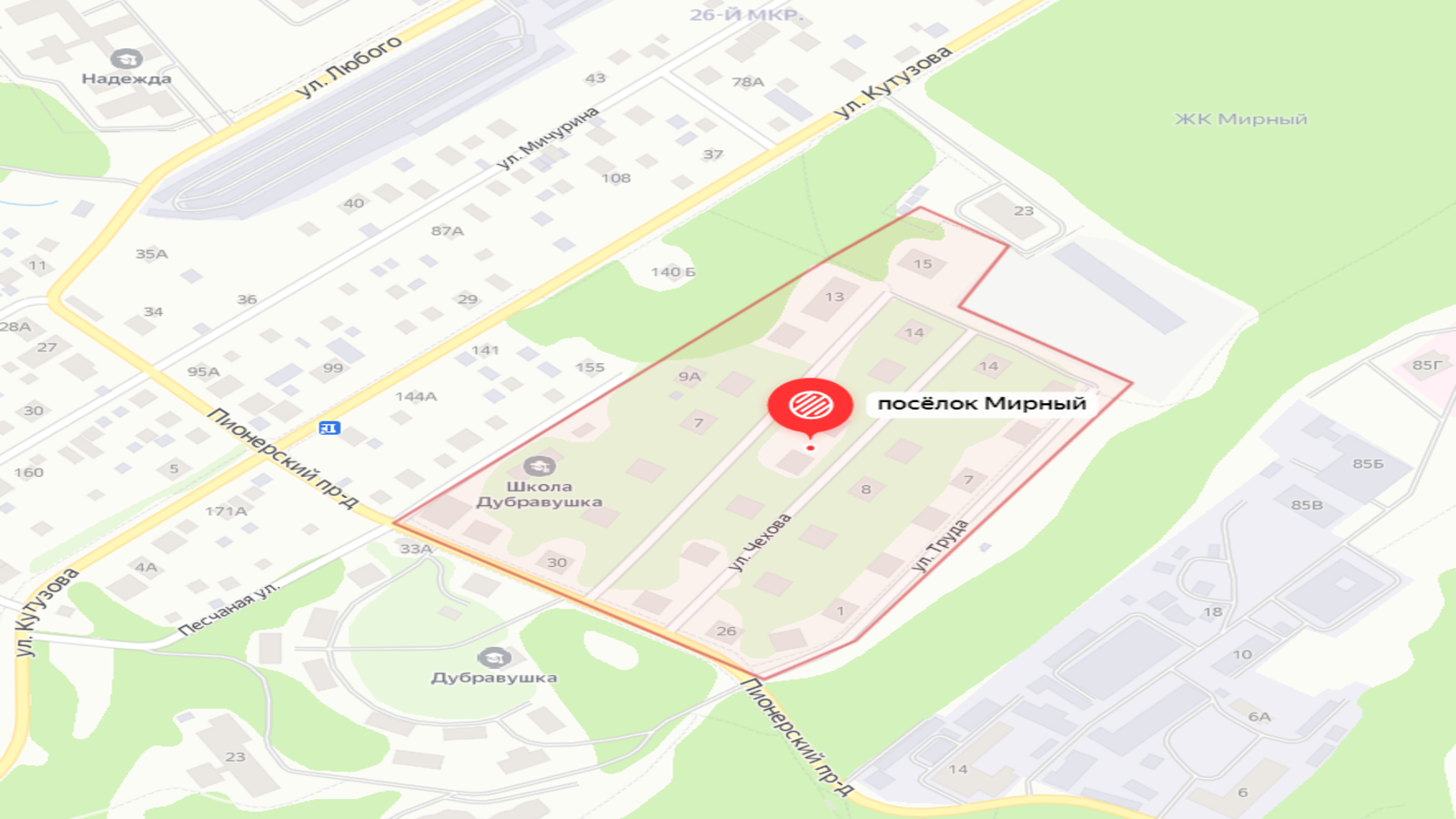 Поселки Обнинское и Мирный, расположенные на окраине города, считаются спальными районами. Здесь преобладает частный сектор, где, к сожалению, все еще можно встретить ветхие дома, подлежащие сносу.
