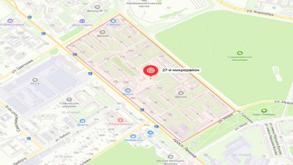 27 район отделен от центра города Гурьяновским лесом, но это не мешает ему быть одним из самых оживленных районов Обнинска.