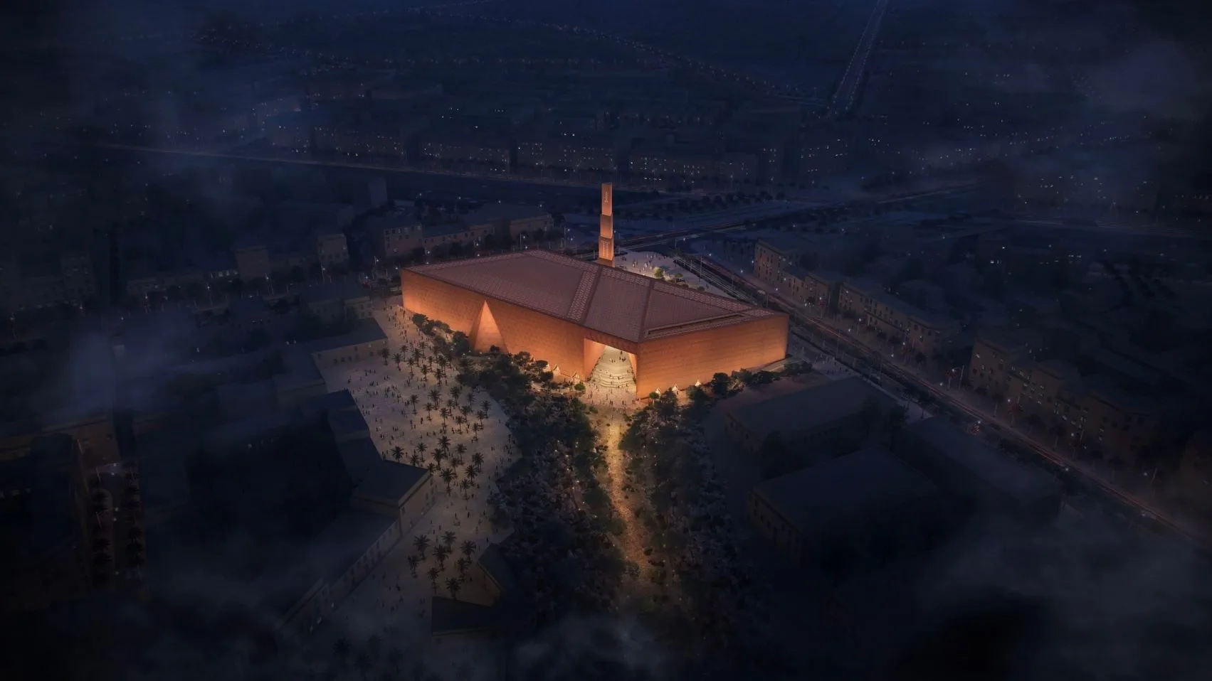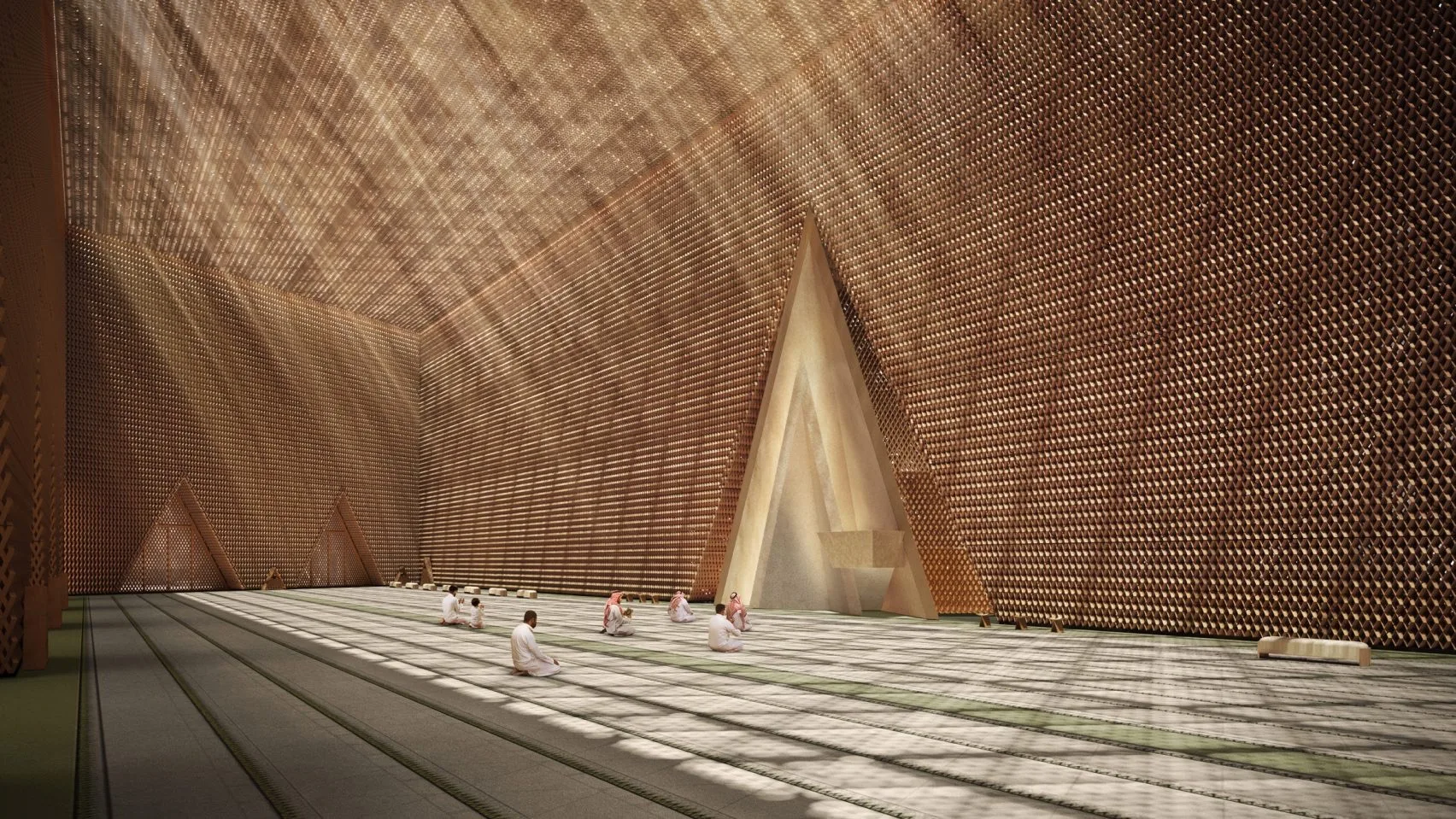 Функционально здание выходит далеко за рамки традиционного молитвенного дома. Помимо залов для намаза здесь предусмотрены лекционные пространства, библиотека, главная площадь, озеленённые террасы и камерные внутренние дворы. Библиотека получит особое расположение — с видом на долину Вади Ханифа, вдоль берегов которой тянется крупнейший природный парк Саудовской Аравии. Такое соседство превращает её не просто в хранилище книг, а в полноценное место для уединения и созерцания.