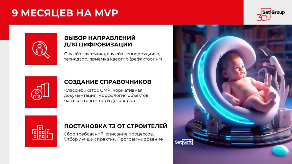 Так, по его словам, было принято решение о создании единой системы коммуникации между всеми строителями. И за девять месяцев компания реализовала MVP, в которую входили службы заказчика, генподрядчика, технадзор.