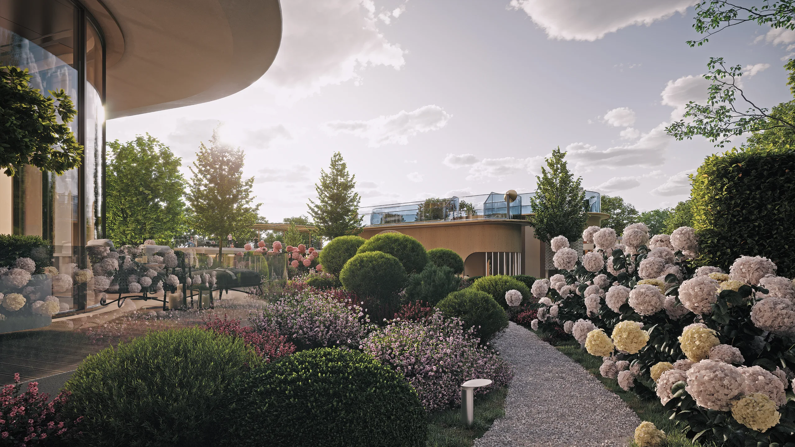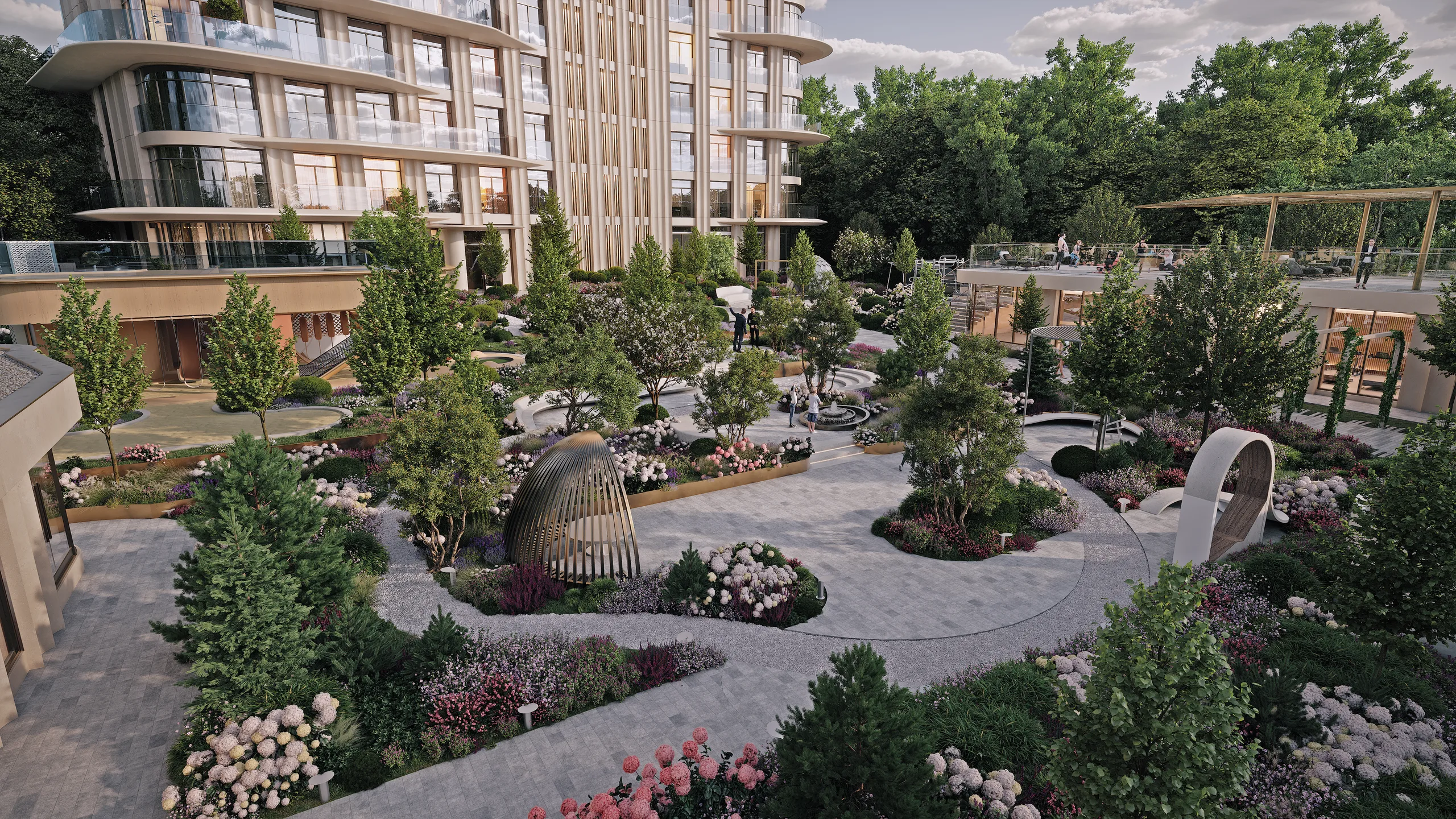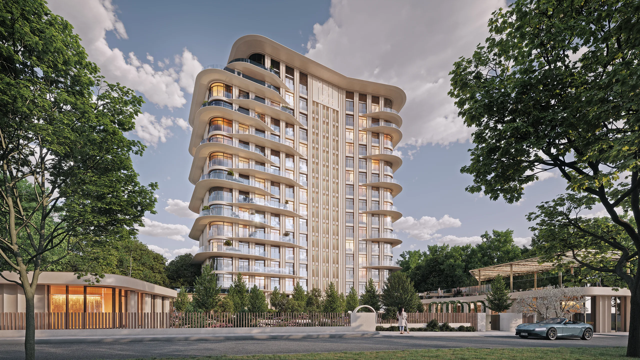 Концепция благоустройства клубного дома KING & SONS основана на принципах многоуровневого зонирования. На нижнем уровне двора расположен закрытый двор с «секретным садом» площадью около 3 000 квадратных метров, где будут расти экзотические растения и вечнозеленые деревья. Здесь предусмотрены места для встреч у открытого огня, маршруты для прогулок, детская площадка, зоны для занятий спортом и отдыха. Второй уровень формируют террасы на крыше спортивного павильона с лаундж-зонами, площадками для йоги и детской смотровой зоной. Третий уровень – это эксплуатируемая кровля площадью 800 квадратных метров с видовой площадкой и кинотеатром под открытым небом. Вертикальный сценарий благоустройства увеличивает общую площадь зеленых пространств на 30% и создает ощущение непрерывности – от сада во дворе до открытого неба над домом.