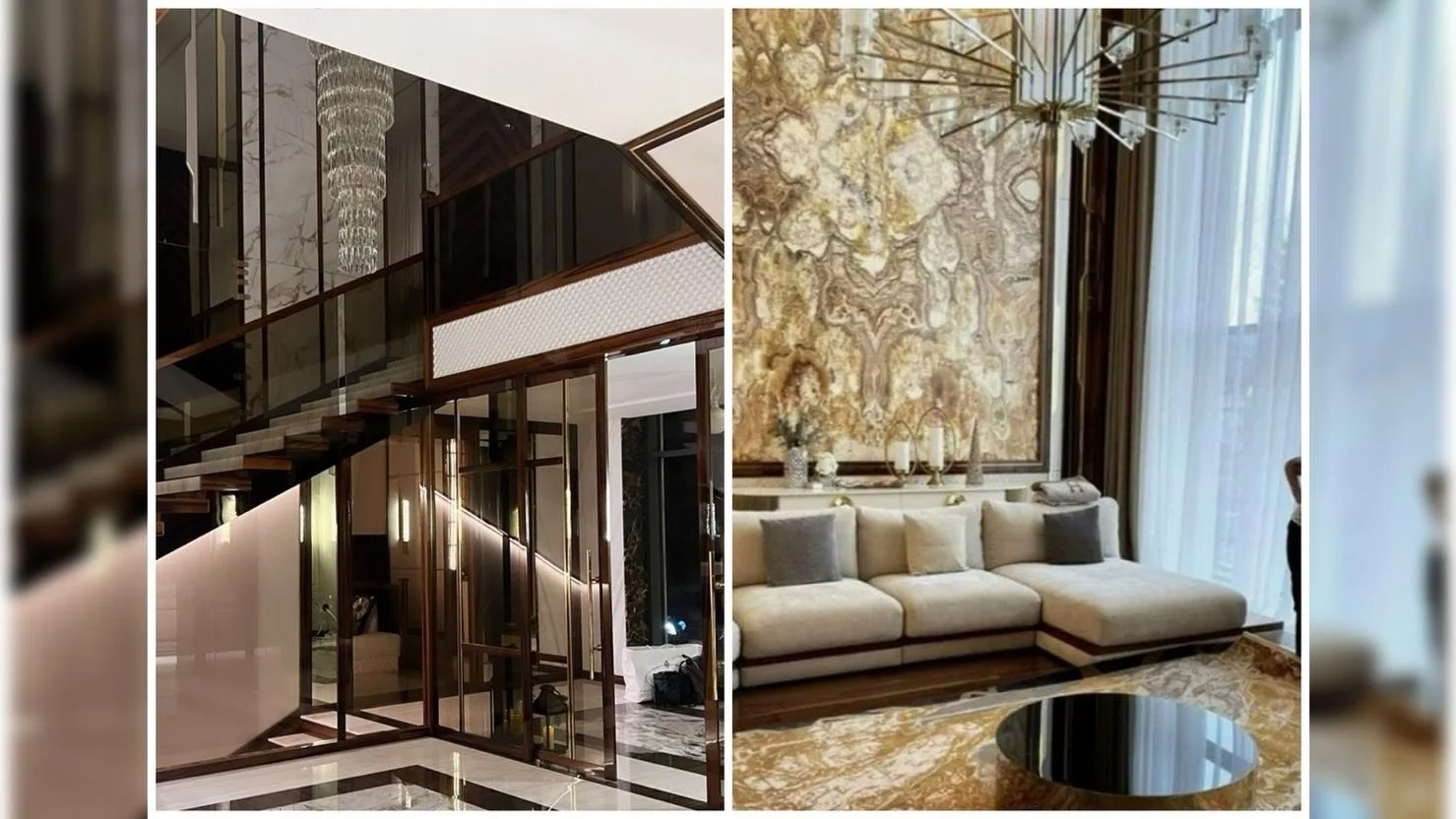 Первое, что поражает при входе, — масштаб. Просторный холл больше напоминает лобби дорогого отеля или бутика премиум-класса, чем частный дом. Высокие потолки, сложный свет, эффектная люстра и стеклянная лестница задают тон всему интерьеру.