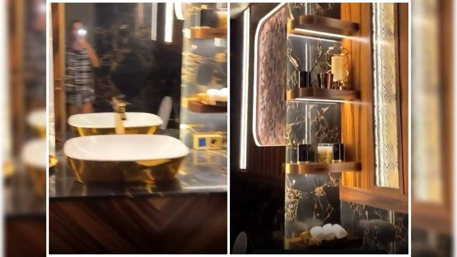По словам хозяйки дома, в особняке семь санузлов, и все они выполнены в единой стилистике. Много зеркал, сложное освещение, встроенные системы хранения — каждый санузел продуман как полноценное пространство, а не второстепенная зона.