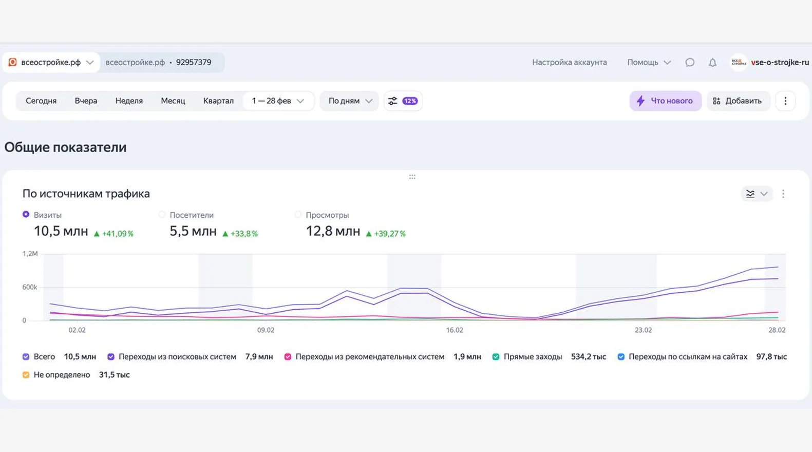 Согласно данным из Яндекс Метрики, по итогам февраля на портале Всeостройке.pф было зафиксировано 5,5 млн уникальных читателей и 12,8 млн просмотров.