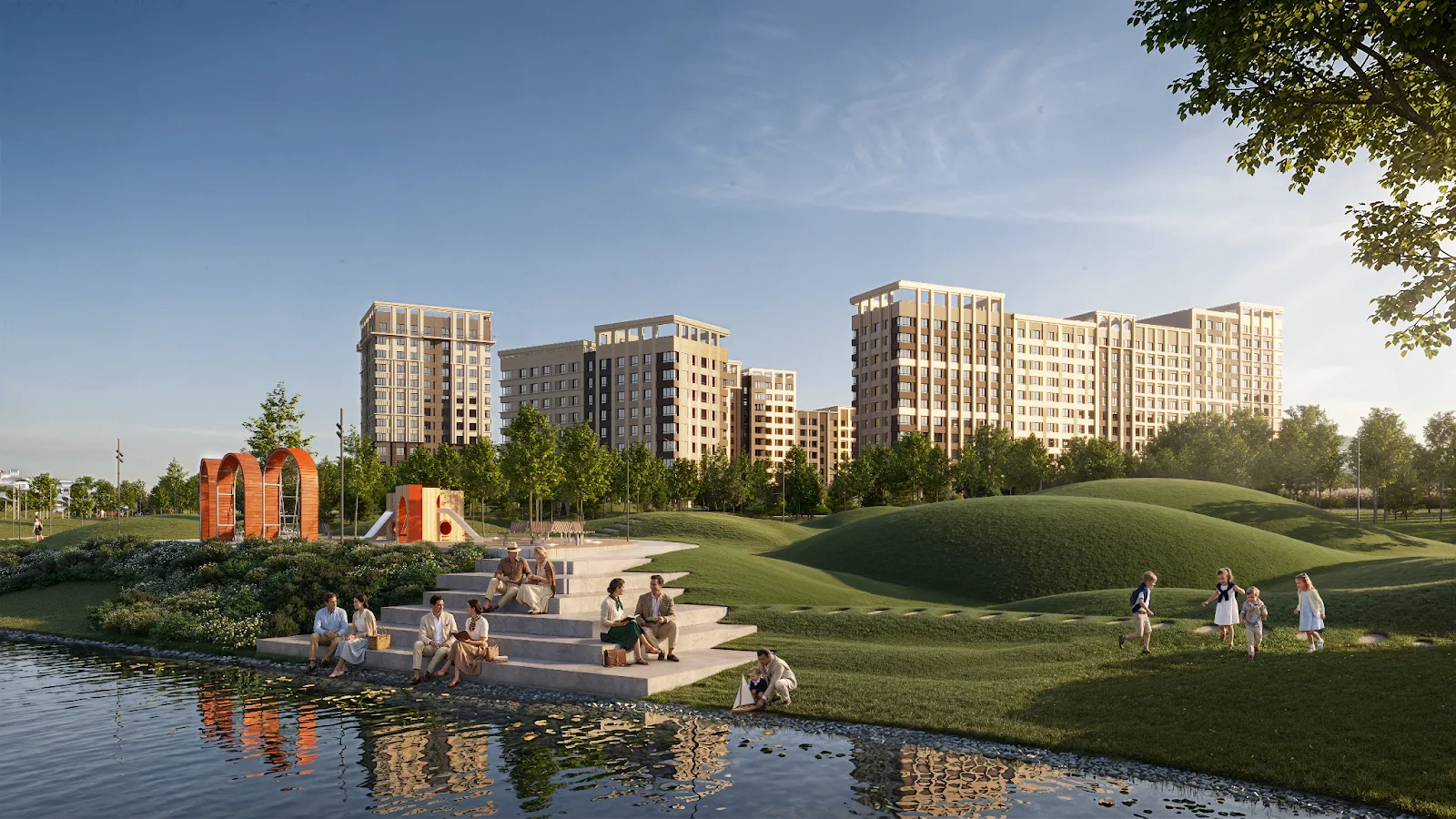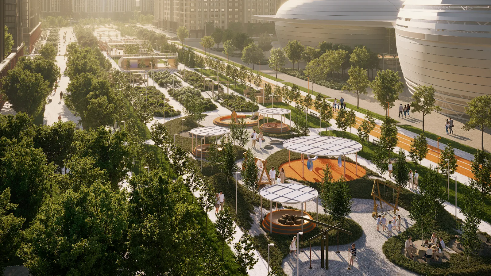Отдельный акцент сделан на благоустройстве, площадь которого достигает 30 гектаров. Проект включает реку с пешеходной набережной, каскадные водоемы, мосты, амфитеатры, смотровые площадки, зоны для праздников и фестивалей. Автором концепции благоустройства выступит Pergaev Bureau, известное уникальными российскими и международными архитектурными проектами.