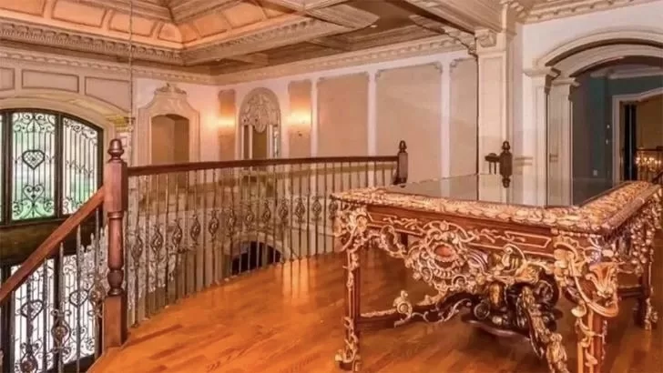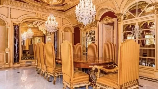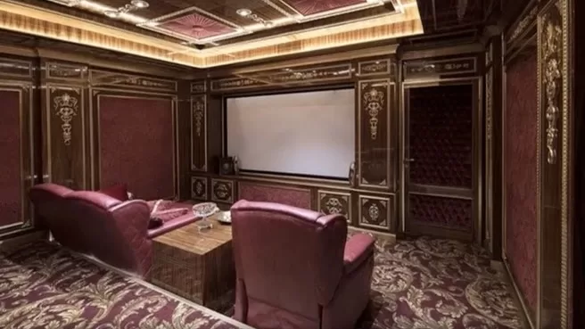 Внутри особняка можно увидеть хрустальные люстры, которые сверкают под высокими потолками, а мебель из натурального дерева гармонично дополняет общий стиль. Просторная гостиная с уютным камином и роскошная столовая, способная разместить до десяти гостей, создают атмосферу уюта и комфорта. Кухня также впечатляет своими размерами и качеством отделки.