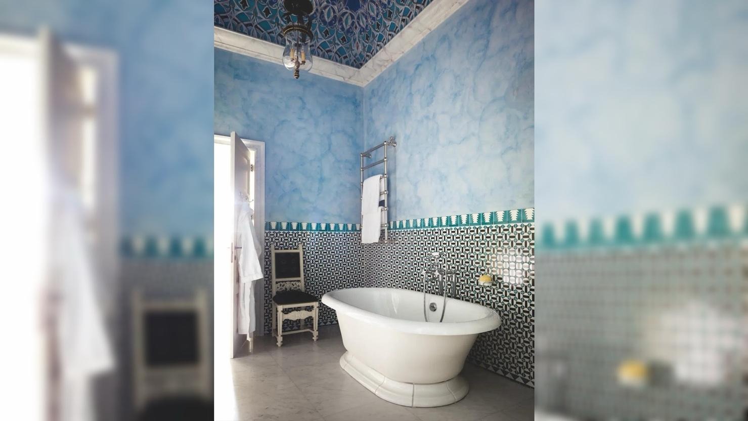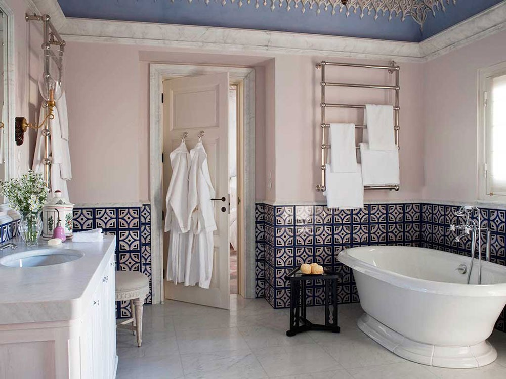 Даже в ванных комнатах чувствуется индивидуальный подход: ванна, привезенная из США, соседствует с плиткой, выполненной итальянскими мастерами в восточном стиле. Такое сочетание подчеркивает международный характер семьи Коппола.