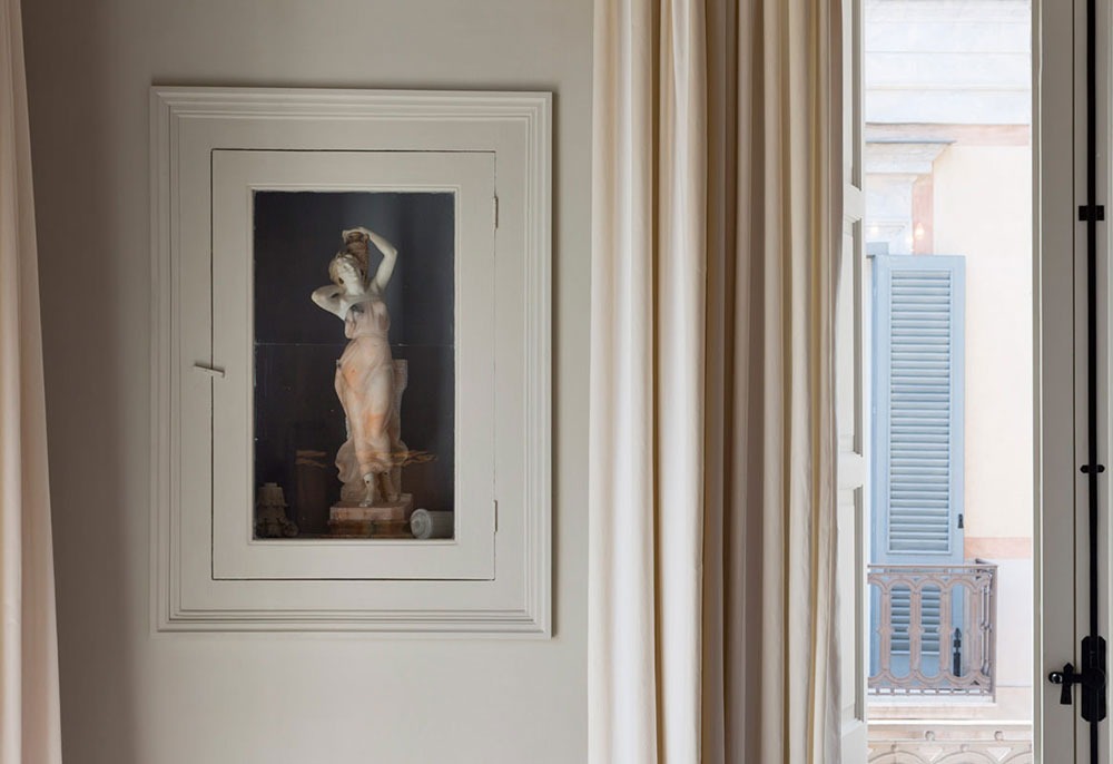 Пространство получилось более мечтательным и романтичным. Отреставрированный терраццо на полу, винтажный диван, произведения современного искусства и мягкие фрески формируют атмосферу кинематографической меланхолии, характерной для фильмов Софии.