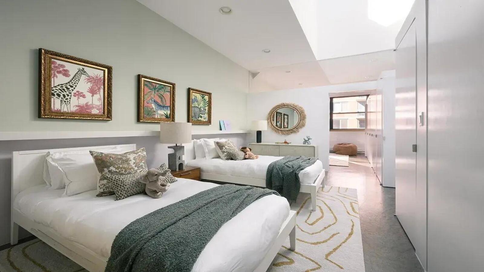 Основная спальня находится в угловой части квартиры, что обеспечивает дополнительную тишину и приватность. Из окон открываются виды на реку Гудзон и парк Хай-Лайн — один из самых узнаваемых городских ландшафтов современного Нью-Йорка.