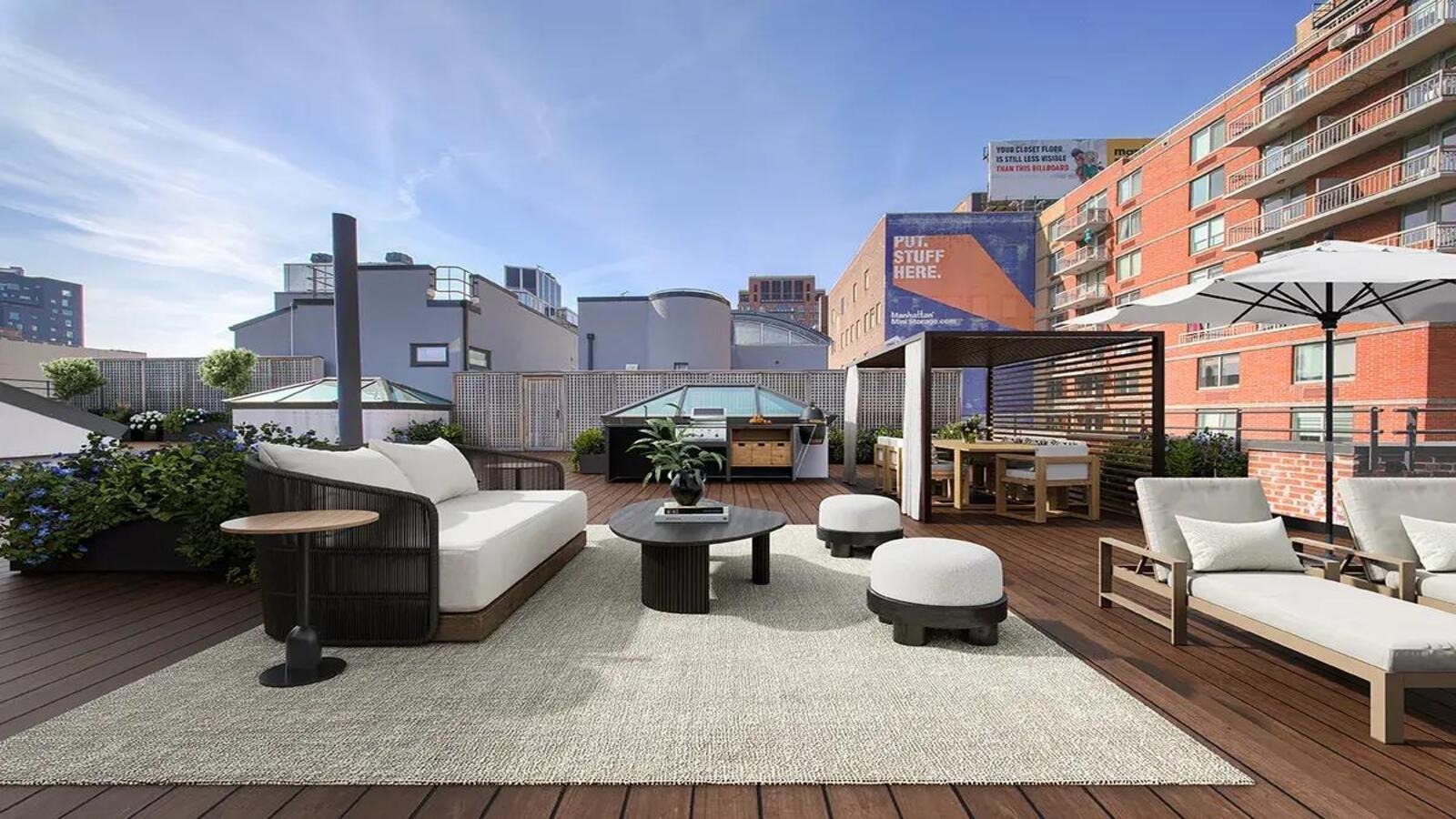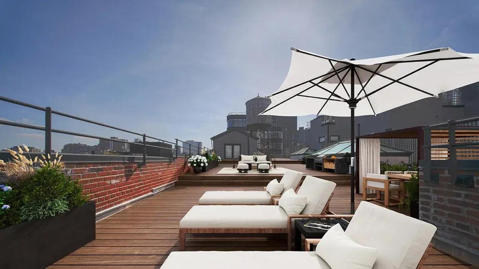 Отдельного внимания заслуживает собственная терраса пентхауса. Она разделена на несколько зон для отдыха и открывает виды на городской пейзаж Манхэттена.