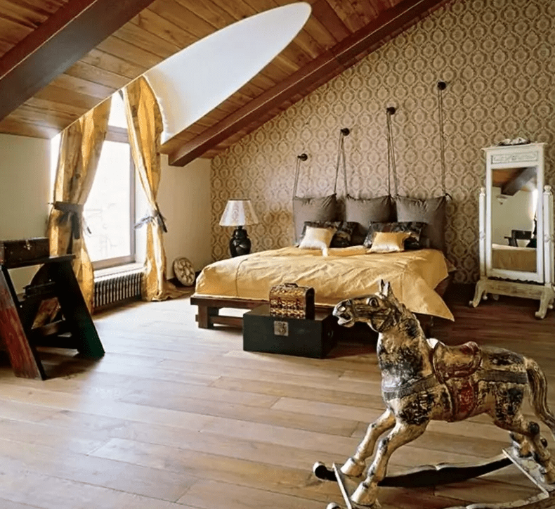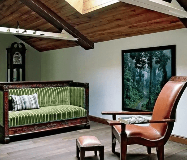 Пол и крыша комнаты отделаны деревом. Овальные окна наполняют комнату светом. В гостиной много винтажной мебели.