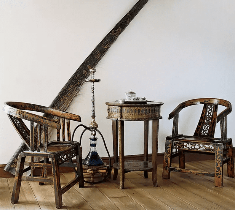 Особое внимание обращают на себя винтажные, резные стулья и роскошный мраморный камин.