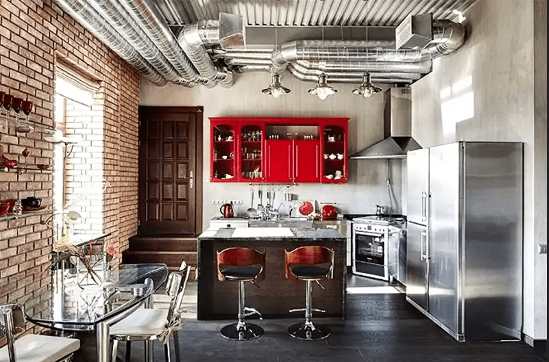 Пространство кухни оформлено в индустриальном стиле. Дизайнеры намеренно не стали прятать от глаз вентиляционные трубы под потолком. Они отливают хромом и отлично гармонируют с большим холодильником в стиле металлик, внушительной вытяжкой, духовым шкафом и столом-островком.