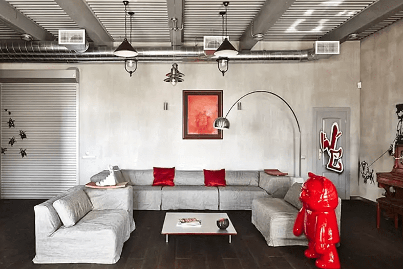 В этом царстве всех оттенков серого яркими изюминками выделяются детали: красные диванные подушки, картина такого же цвета и алый пластиковый медведь, которого хозяйка привезла из Китая.