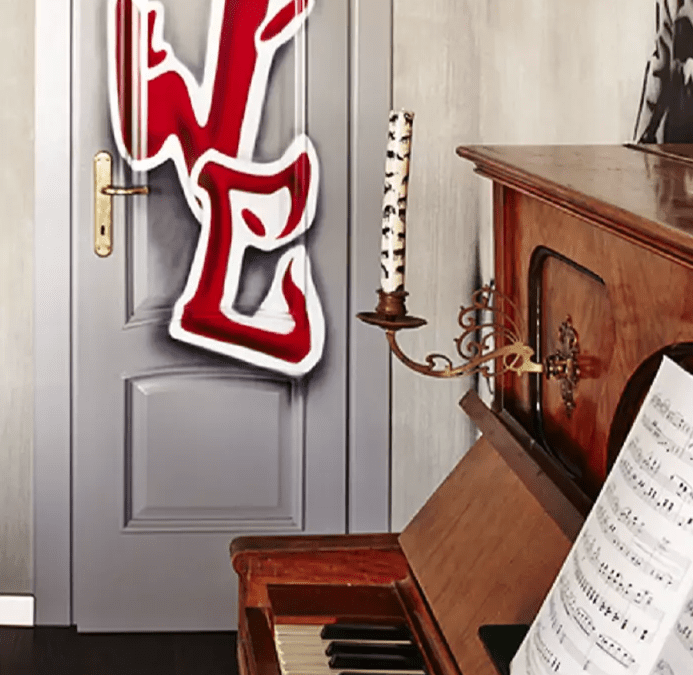 Одну из стен комнаты украшает старинное пианино. Дверь декорирована рисунком в стиле граффити.