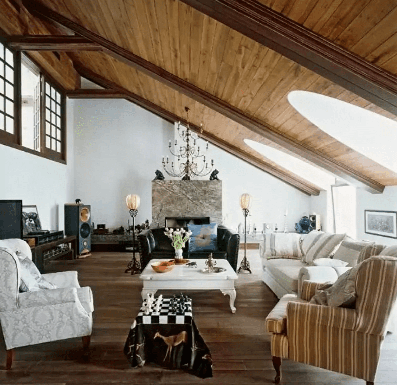 Второй этаж в квартире общественницы разместился на чердаке. Под скошенной крышей дизайнеры обустроили вторую гостиную.