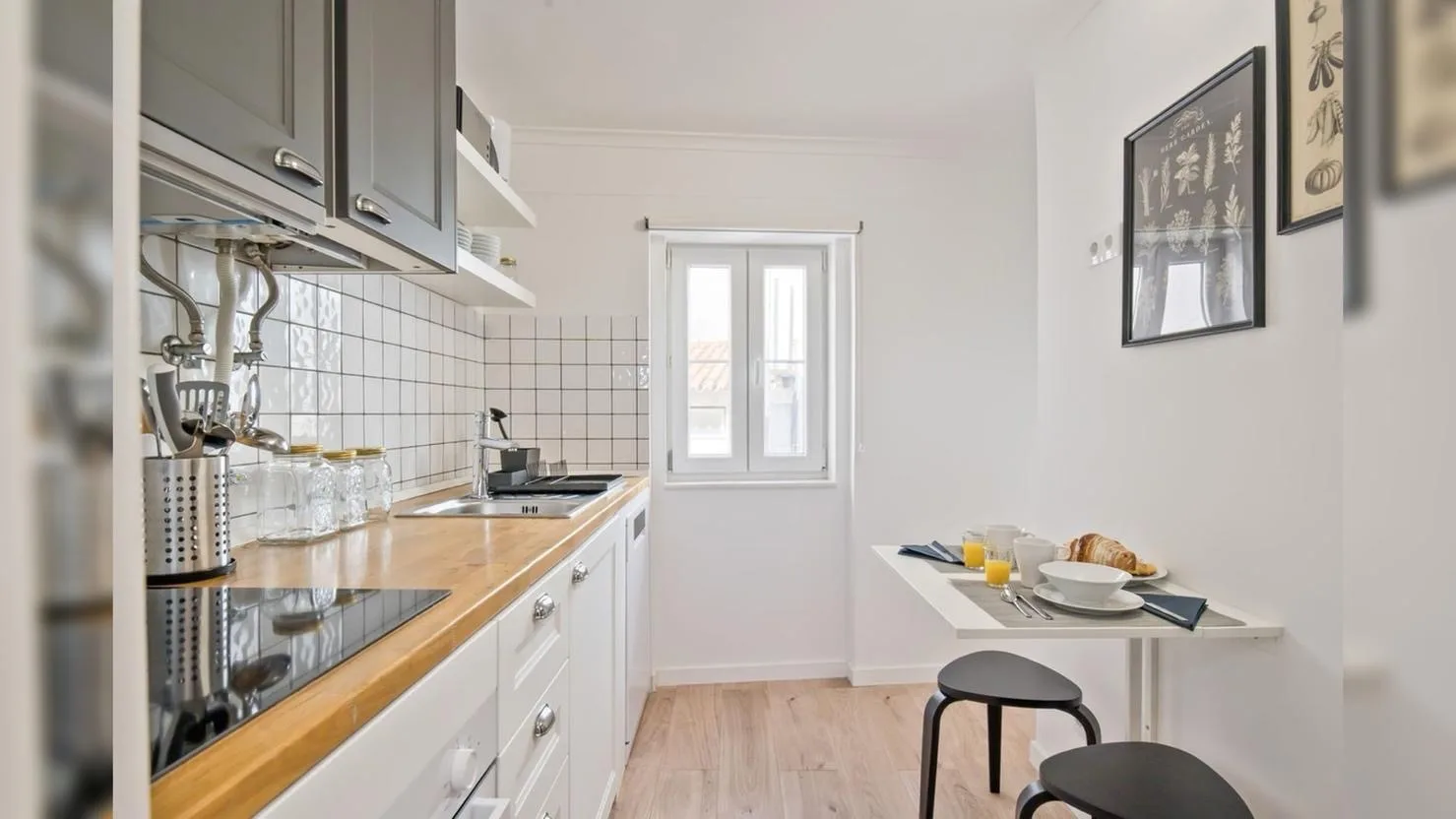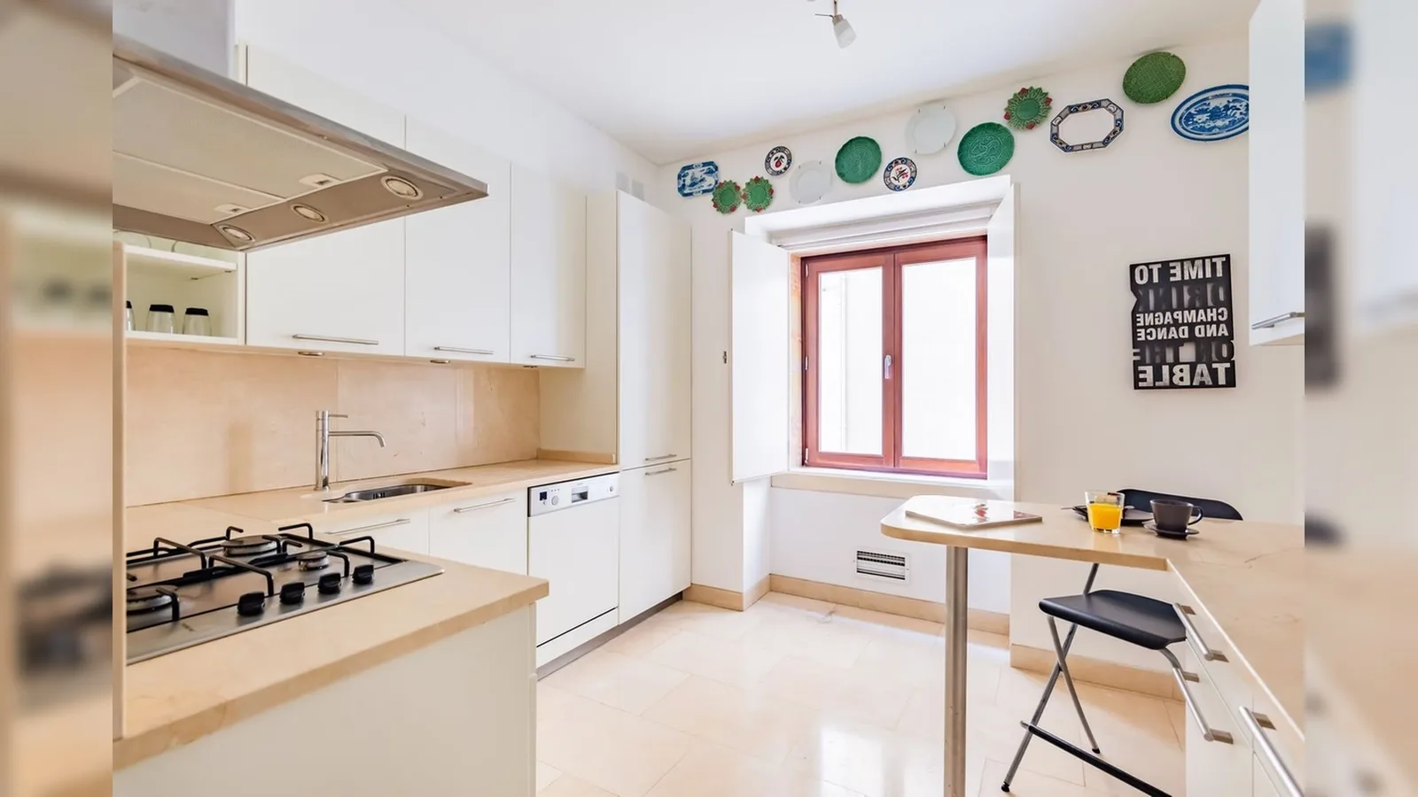 Кухня — отдельная тема. В традиционной португальской квартире это изолированное помещение, а не объединённая зона с гостиной. Причём стены кухни часто полностью облицованы плиткой, а не только рабочая зона. Это не дизайнерский ход, а практическое решение: при активной готовке (особенно рыбы и морепродуктов) поверхности приходится регулярно мыть.