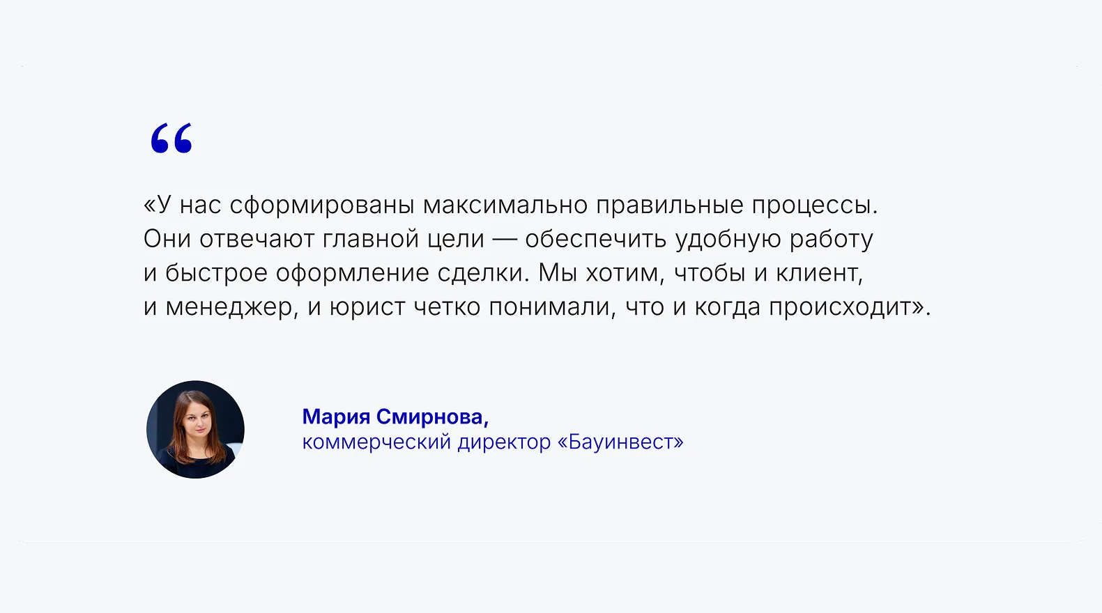 СК «Бауинвест» — стабильный игрок рынка недвижимости, поэтому бизнес-процессы в компании — от получения лида до регистрации договора — детально выстроены и хорошо отработаны.