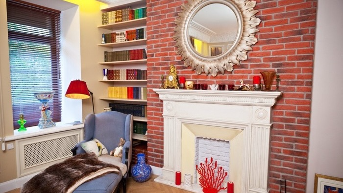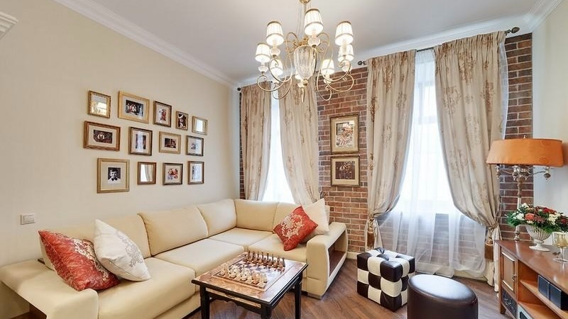 Стены выкрашены в мягкий бежевый оттенок, но одна из них оставлена без отделки, демонстрируя натуральную кирпичную кладку. Этот приём придаёт интерьеру особый шарм, сочетая современный комфорт с исторической аутентичностью.