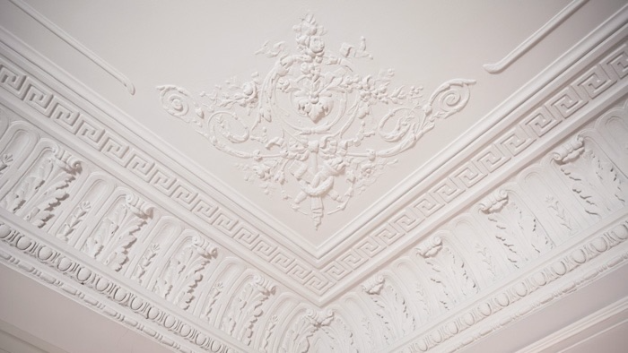 Особого внимания заслуживает декоративный потолок. Центральный элемент композиции — это резная потолочная розетка с растительными и фигурными мотивами, расположенная в углу. От неё расходятся два лепных карниза. Первый карниз украшен фризом с орнаментом в виде греческого меандра, а второй — стилизованным изображением пальмовых листьев, или аканта, что является характерным элементом классической архитектуры.