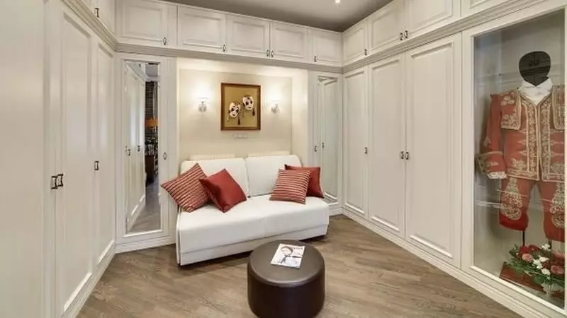 Гостиная — это сердце квартиры, занимающее большую часть её небольшой площади (около 20 квадратных метров). Это помещение служит одновременно зоной для отдыха и местом для хранения сценических костюмов.