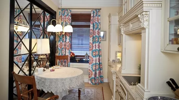 Кухня оборудована всем необходимым. Кухонный гарнитур, выполненный в светлых тонах, занимает всё пространство от пола до потолка, скрывая встроенную бытовую технику. Интерьер разбавляют яркие шторы, зеркальная стена и низкий подоконник, который выполняет функции дизайнерской полки.