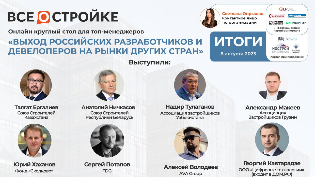 8 августа на портале всеостройке.рф состоялся очередной круглый стол на тему: «Выход российских разработчиков и девелоперов на рынки других стран».