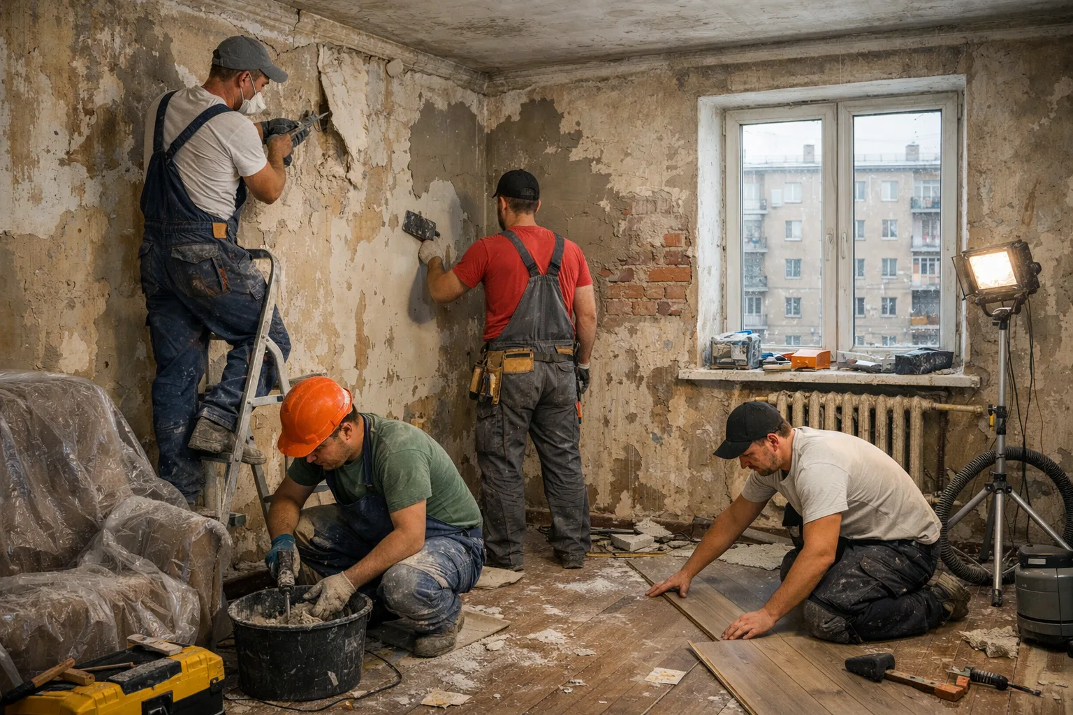 - Демонтаж. Снять старые обои, содрать линолеум, демонтировать плинтуса и наличники. Физически тяжело, но технически просто. Главное — не трогать несущие стены и коммуникации.