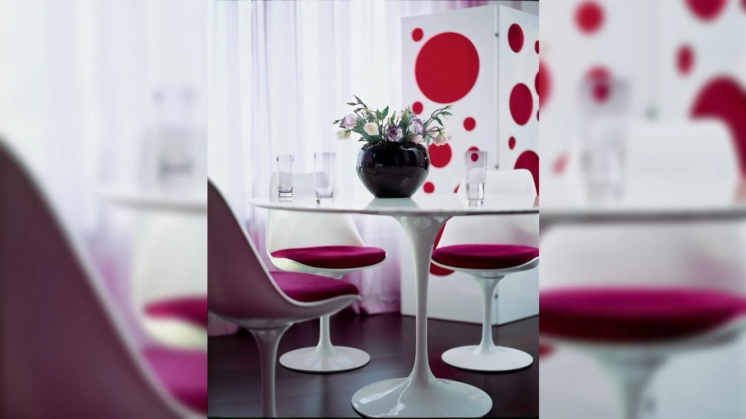 Проект был реализован при участии дизайнера Ариадны Шмандуровой, которая предложила развить идею «обтекаемого» пространства. В интерьере практически отсутствуют острые углы: мебель, светильники и даже декоративные элементы поддерживают плавную геометрию. Гостиная — центральное пространство квартиры — демонстрирует этот подход наиболее ярко. Полукруглый диван, мягкие кресла и светящиеся пуфы формируют замкнутую композицию, подчеркивая форму помещения. Даже окно здесь превращено в арт-объект: оно оформлено как круглая «луна» с интегрированной подсветкой. Это пример того, как архитектурный недостаток (нестандартный проем) можно превратить в визуальное преимущество. Отдельного внимания заслуживает выбор мебели и предметов интерьера. В проекте использованы культовые дизайнерские решения, такие как стол Tulip по дизайну Ээро Сааринена, что добавляет пространству стилистической глубины. Для строительного портала это важный момент: грамотное сочетание архитектуры и предметного дизайна усиливает ценность объекта.
