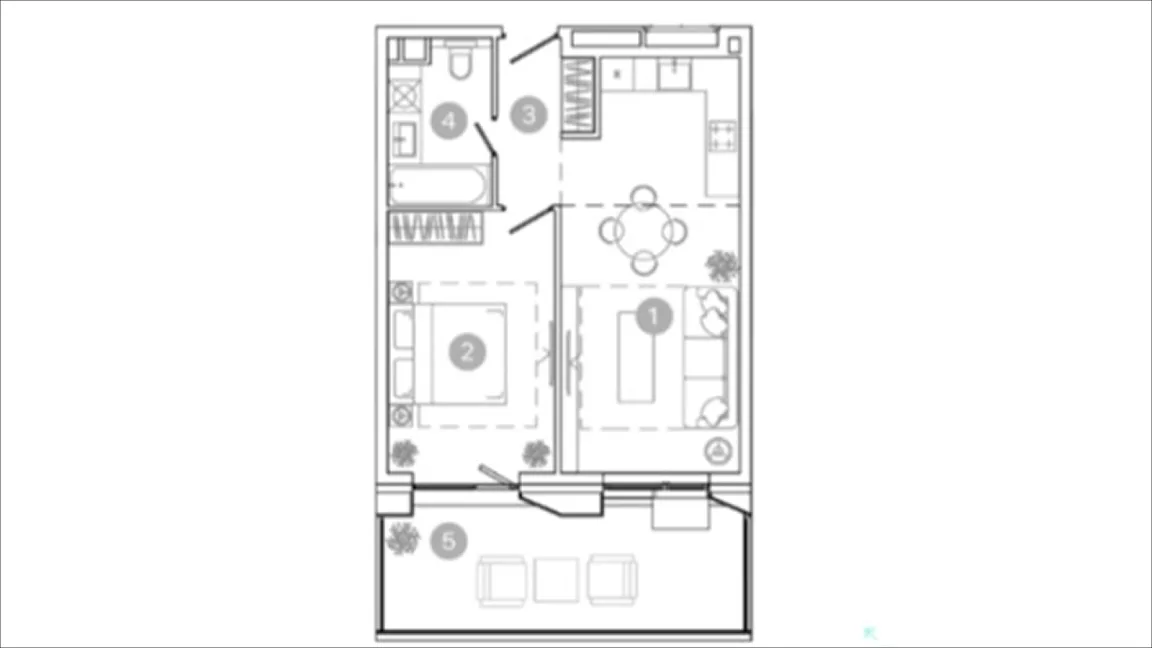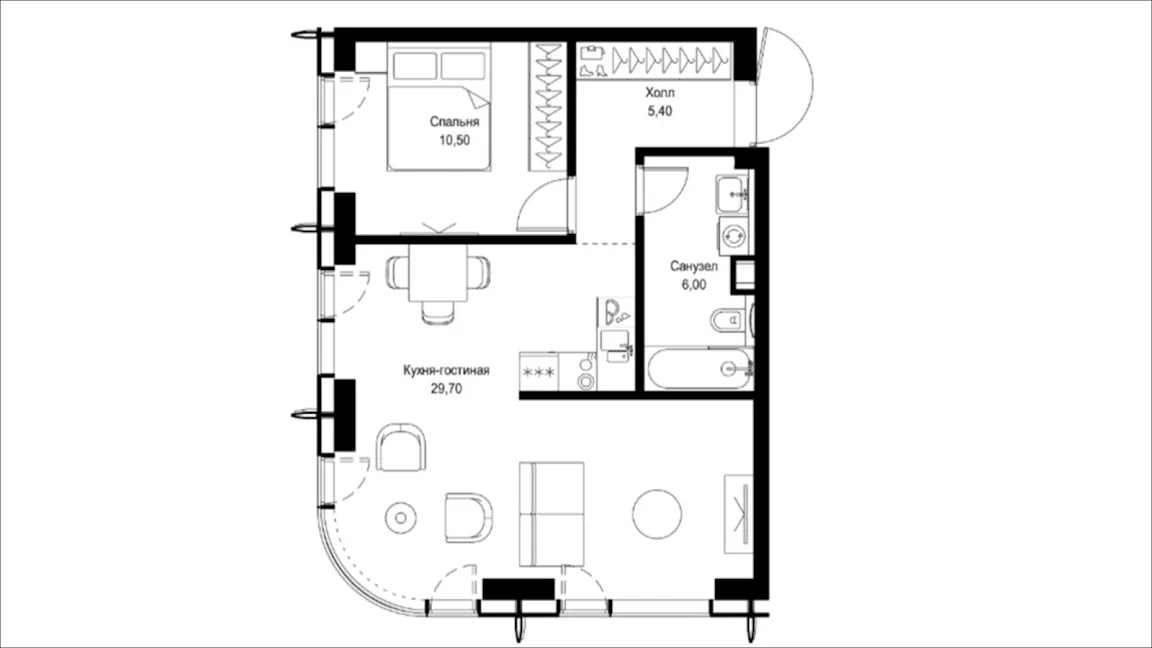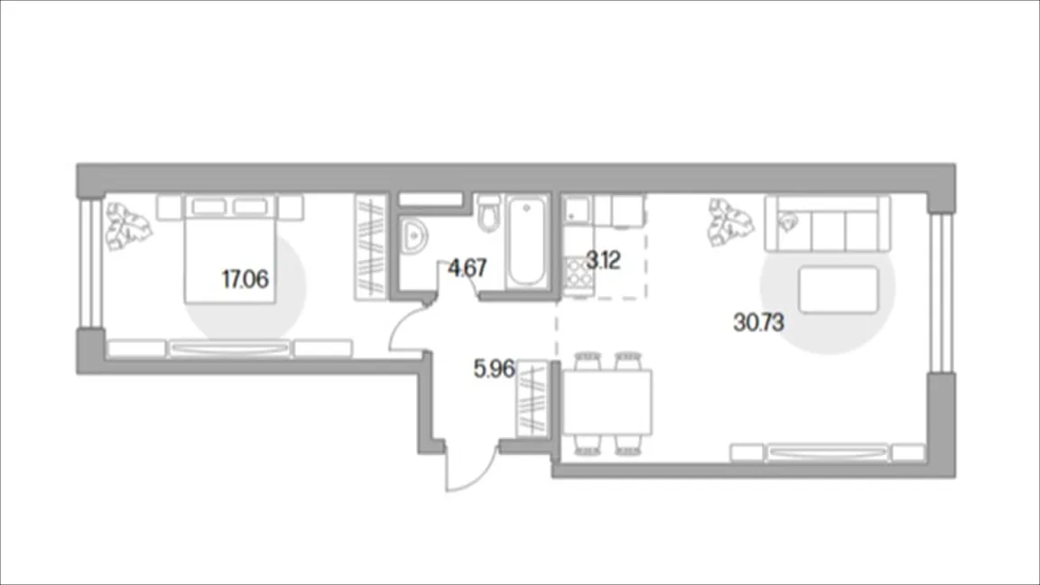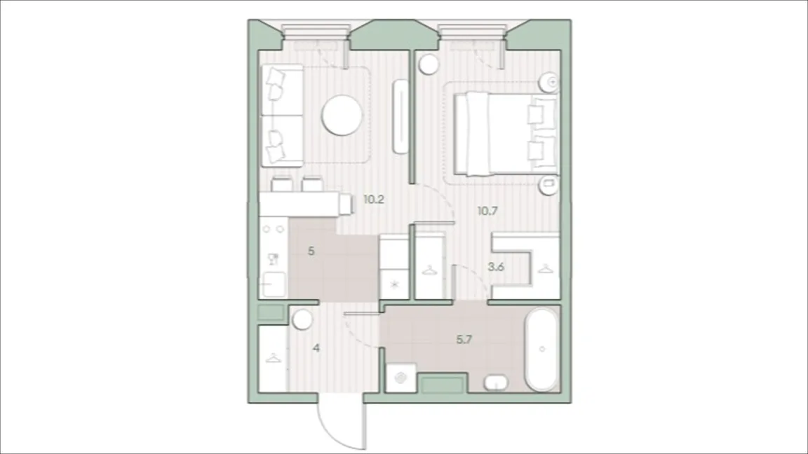 Прихожая выполняет роль распределительного узла, но не превращается в длинный коридор. Из нее есть только три выхода — в спальню, в общую зону и ванну, что исключает потерю площади на транзитные галереи. Вся остальная площадь распределена между двумя основными помещениями, каждое из которых получает достаточно метража для полноценного использования. Интересное решение, когда эргономика строится не на сложных архитектурных приемах, а на логике разделения потоков.
