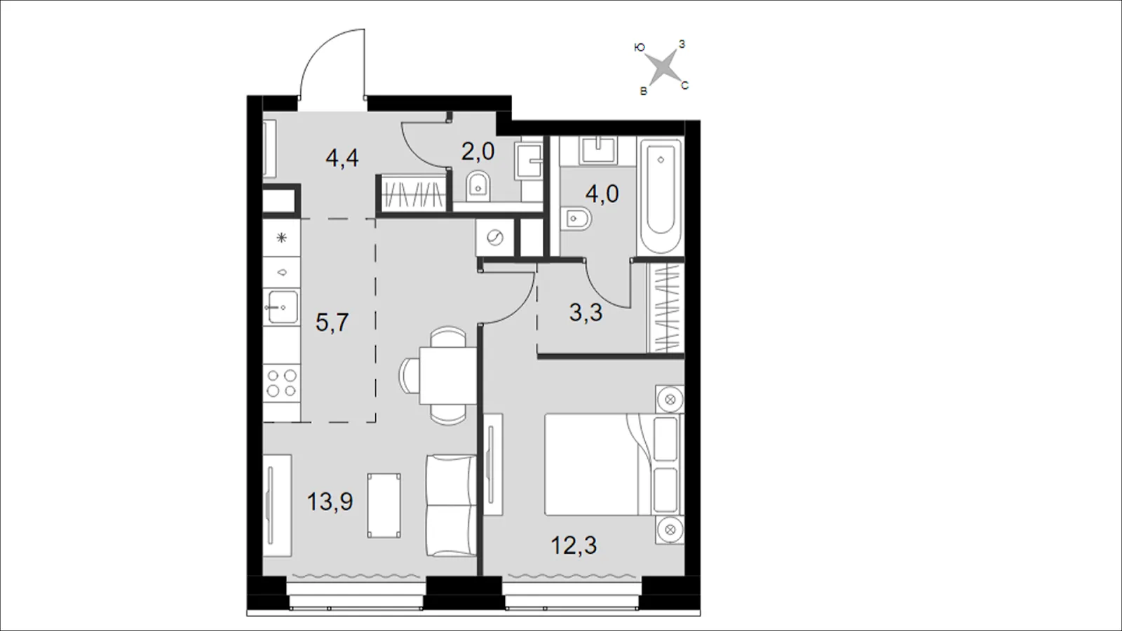 Площадь этой евродвушки в ЖК Balance еще скромнее — 33,2 квадратных метра. Это еще один пример продуманного компактного жилья, где полезно использован буквально каждый угол.