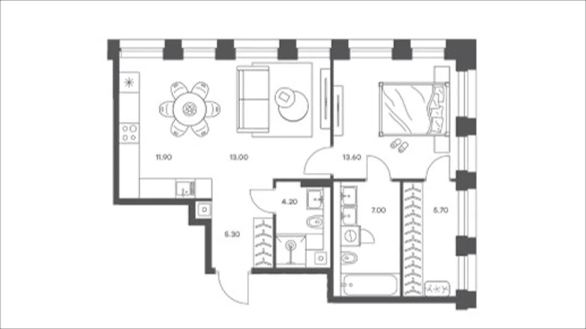 Центральным элементом в этой планировке становится просторная кухня-гостиная площадью почти 30 квадратных метров. Такой метраж позволяет по-настоящему реализовать полноценное зонирование: здесь найдется место и для кухонного гарнитура с островом, и для просторной обеденной группы, и для большой мягкой зоны с диванами, не создавая при этом ощущения тесноты или захламленности. Панорамное остекление визуально расширяет границы квартиры, «впуская» в интерьер городской пейзаж. При этом здесь предусмотрены и ниши для организации мест для хранения в холле, и просторный совмещенный санузел площадью 6 кв. метров.