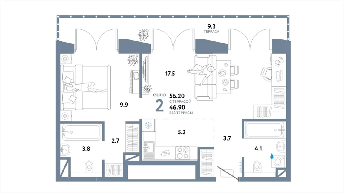Терраса площадью 4,6 кв. метра примыкает сразу и к спальне, и к кухне-гостиной — и в данном случае выполняет утилитарную функцию. Она увеличивает световой поток в основные помещения и в теплый сезон может использоваться как дополнительная зона для отдыха или приема пищи, разгружая основное пространство квартиры.