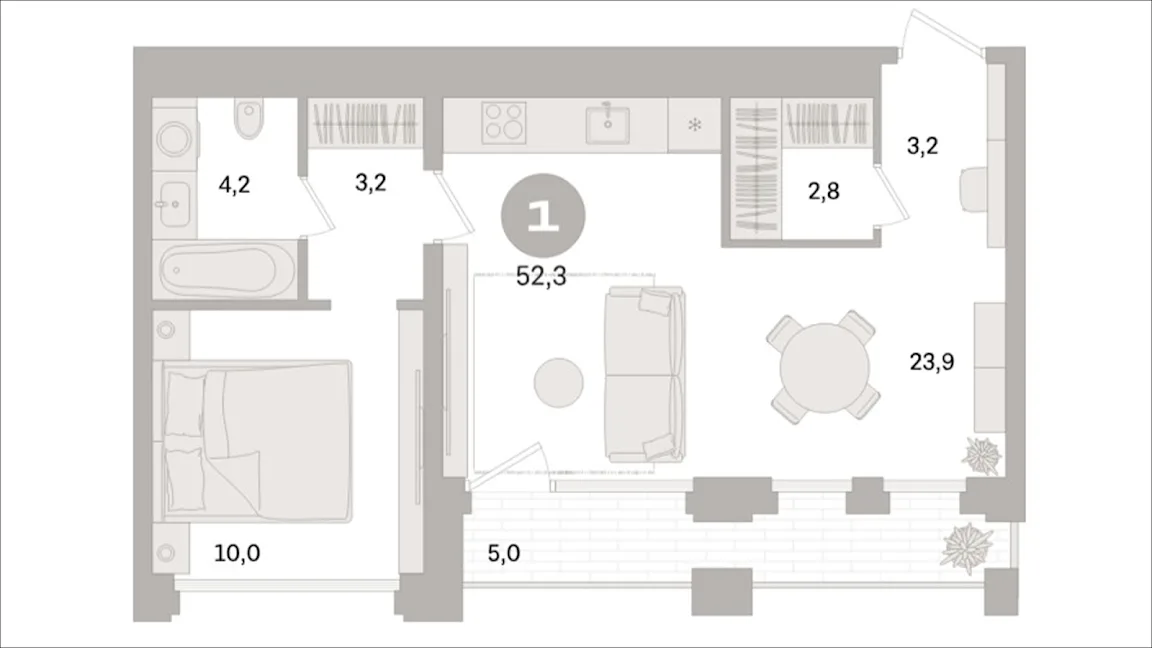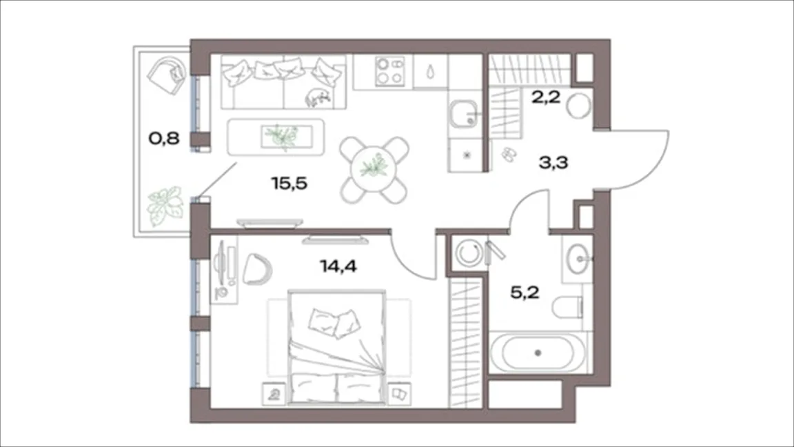 Главное достоинство — четкое разделение на полноценную кухню-гостиную (15,5 кв. метра) и отдельную спальню (14,4 кв. метра). При такой площади общая зона позволяет комфортно готовить, принимать гостей и отдыхать всей семьей, не создавая тесноты. Балкон, выходящий именно из кухни-гостиной, расширяет полезное пространство и служит дополнительной функциональной зоной. А наличие встроенных ниш под шкафы и в прихожей, и в спальне избавляет от необходимости загромождать проходы и жилое пространство мебелью, решая вопросы хранения заранее.