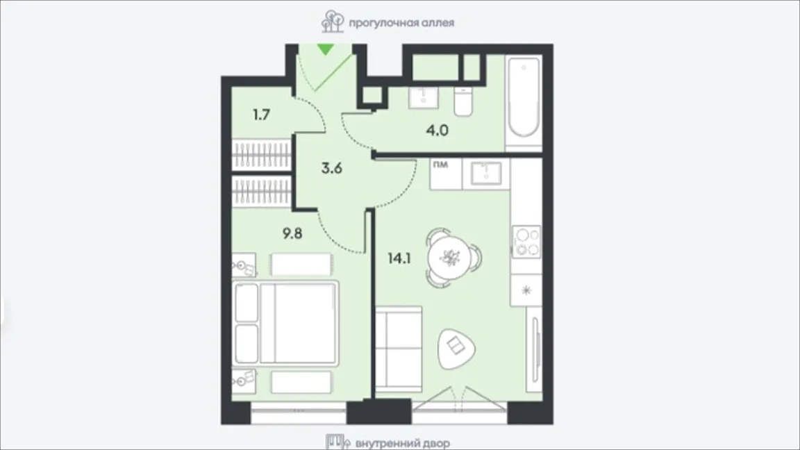 Основное преимущество планировки — пропорции помещений. Кухня-гостиная площадью 22,4 кв. метра является действительно универсальным пространством. Этого метража достаточно, чтобы одновременно разместить полноценную кухонную зону, обеденный стол на 4–6 персон и мягкую группу, сохранив при этом свободные проходы. А спальня площадью 14 кв. метров решает главную задачу любой компактной квартиры — возможность установки двуспальной кровати.