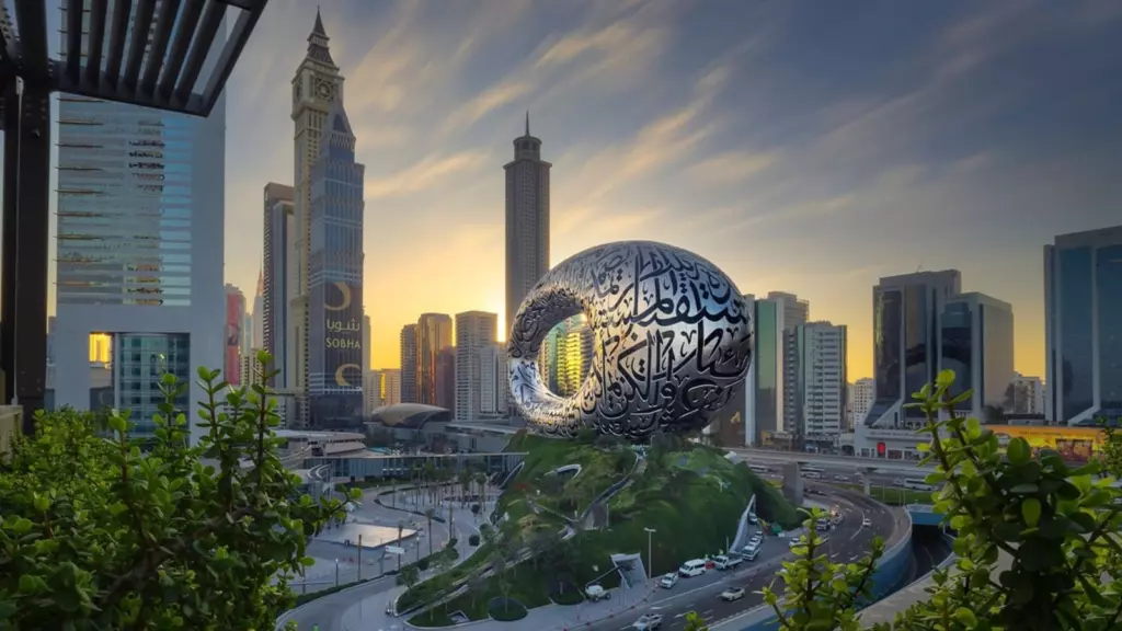 На оживлённой магистрали Дубая, шоссе Шейха Зайда, возвышается Музей Будущего, заслуживший признания одним из самых впечатляющих архитектурных шедевров мира. Изящная резьба, украшающая всю поверхность здания, дополнена арабской каллиграфией, привносящей в его облик элемент культурного богатства. Архитектор Шон Килла, создавая форму музея, вдохновлялся видением будущего. Здание организовано вокруг трёх ключевых элементов: зелёной зоны, основной конструкции и центральной эллиптической пустоты. Взаимодействие этих компонентов символизирует прочность и основательность, креативность человечества, а также стремление познать неизведанные стороны будущего. Архитектурное решение, объединившее в себе эстетику и философию, создаёт мощный образ, отражающий потенциал и инновационность Дубая.