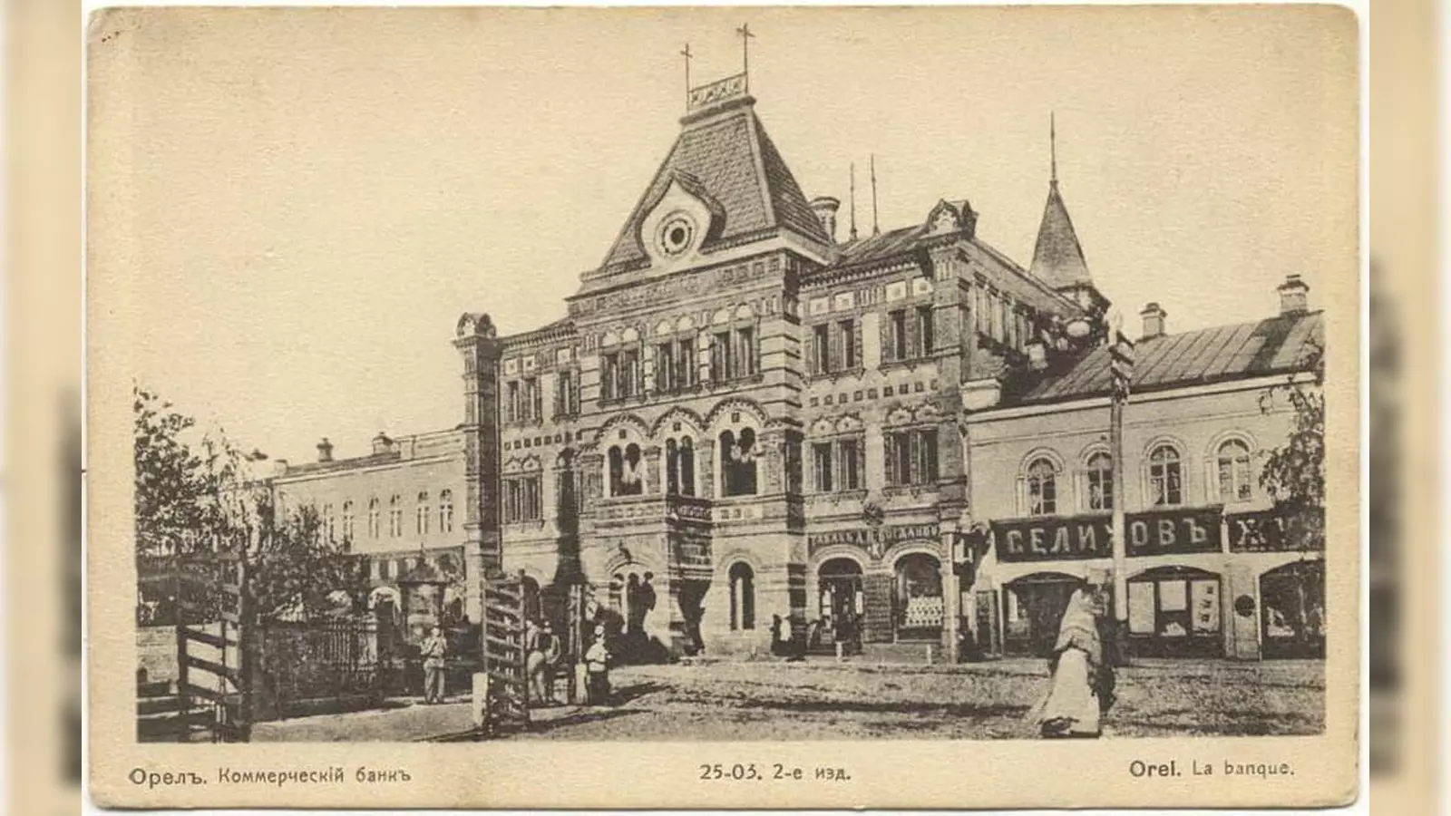 Одно из самых красивых зданий Орла на площади Ленина было построено в стиле модерн в 1908 году. Фасад был отделан глазурованным кирпичом. Третий этаж с епанчовой кровлей здание приобрело уже в наше время после реконструкции.